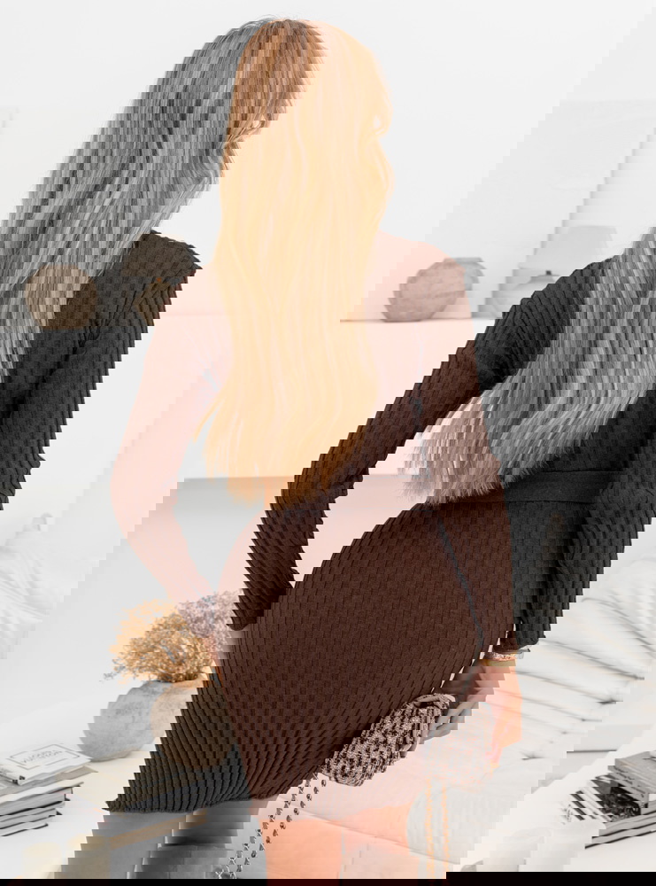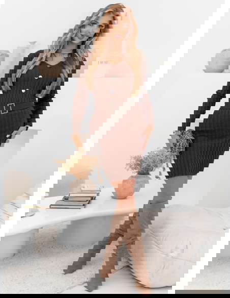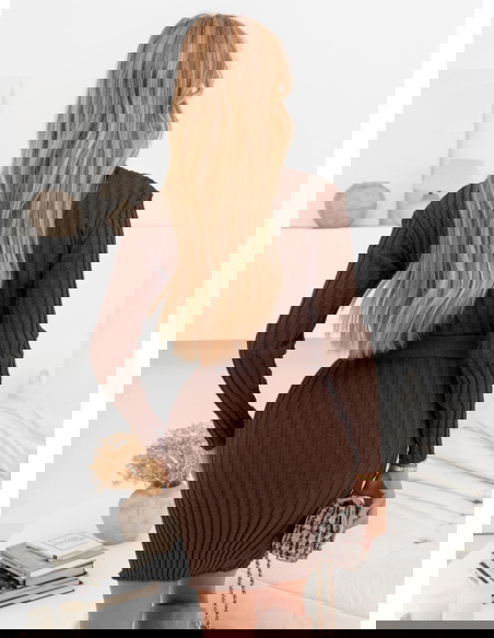 Czekoladowa sweterkowa sukienka z ozdobnymi guzikami Phrona to idealne połączenie przytulności, elegancji i kobiecego stylu. Jej ciepły odcień brązu doskonale wpisuje się w jesienno-zimowy klimat, nadając stylizacji wyjątkowego uroku. To model, który łączy modny, dopasowany krój z nutą klasy i wygody. Delikatnie prążkowana struktura pięknie układa się na sylwetce, podkreślając jej atuty w subtelny sposób. Guziki umieszczone w górnej części dodają całości szyku i wyjątkowego charakteru. To propozycja, która sprawdzi się zarówno na co dzień, jak i w bardziej eleganckich zestawieniach. Długi rękaw i ciepły materiał sprawiają, że to idealny wybór na chłodniejsze dni. W tej sukience każda kobieta poczuje się kobieco, stylowo i komfortowo. Jej klasyczny krój i modny kolor tworzą duet, który nigdy nie wychodzi z mody.