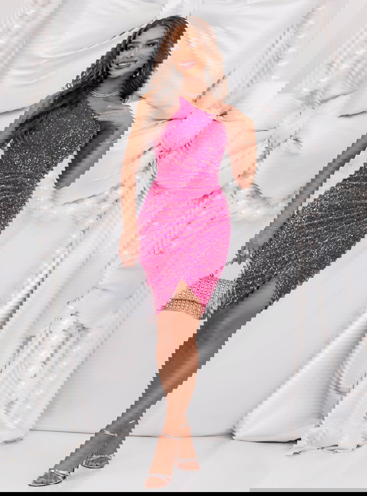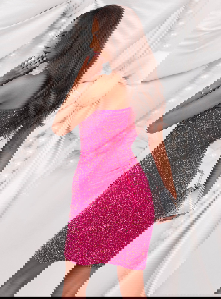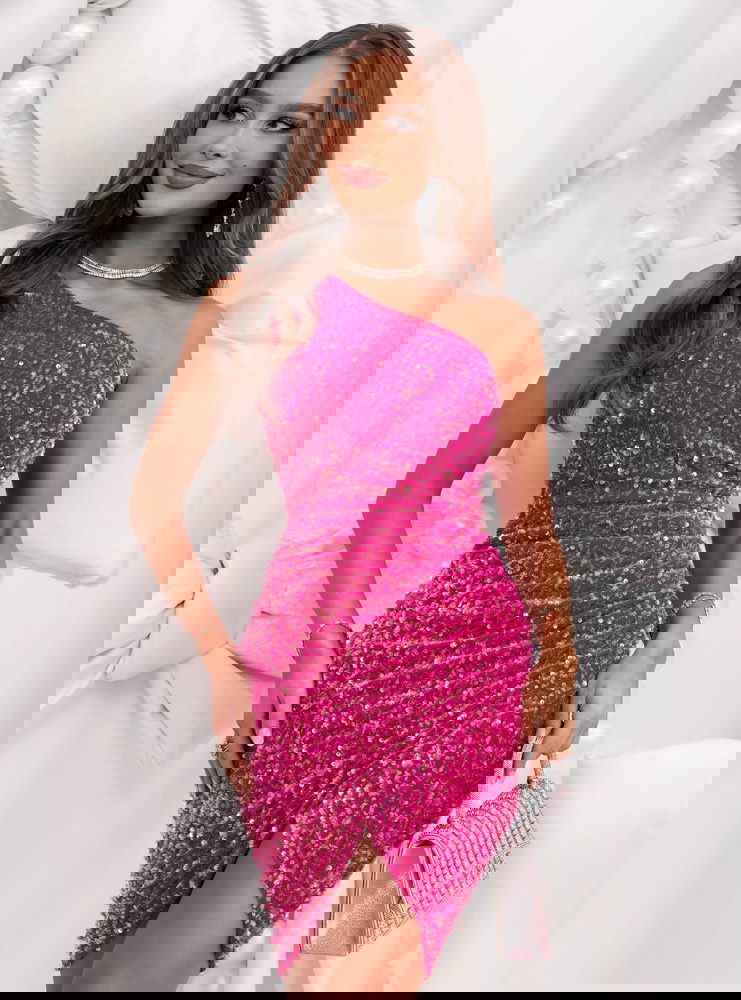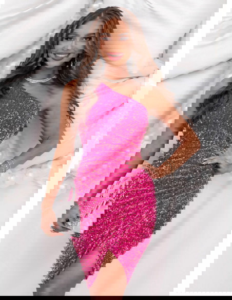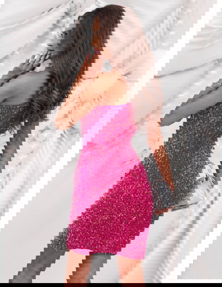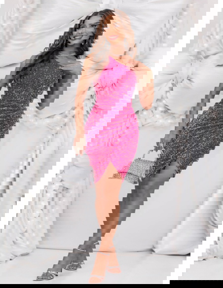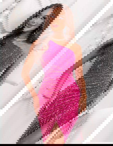 Cekinowa sukienka mini Pearlette - fuksja to połączenie elegancji, błysku i nowoczesnego stylu. Fuksjowy odcień dodaje jej energii, a cekiny tworzą efekt luksusowego blasku. Dopasowany krój pięknie modeluje sylwetkę, a asymetryczne ramię nadaje całości wyjątkowego charakteru.
