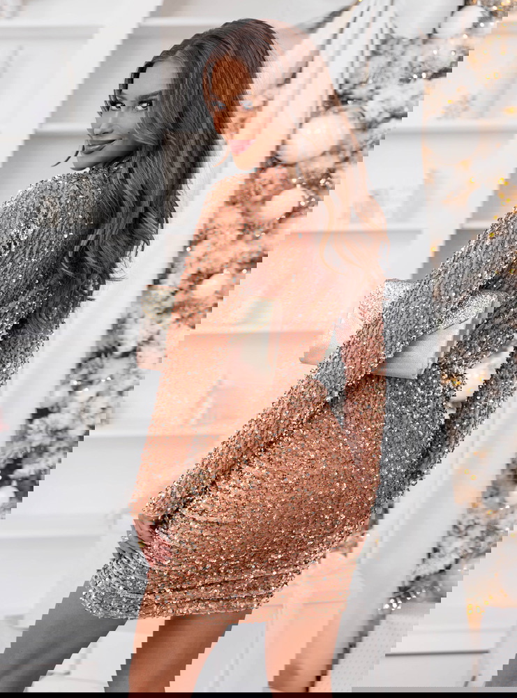 Złota cekinowa sukienka świąteczna z przekładanym dekoltem Leewitt