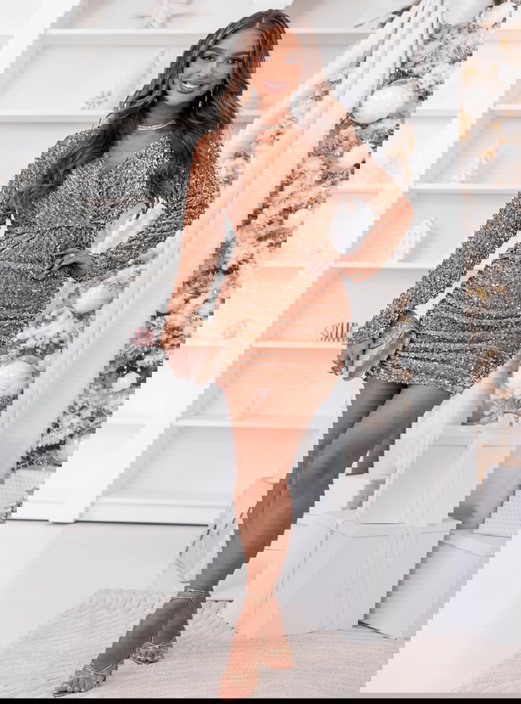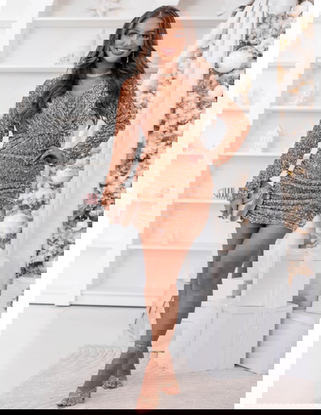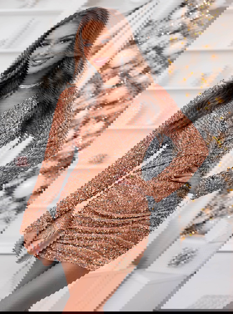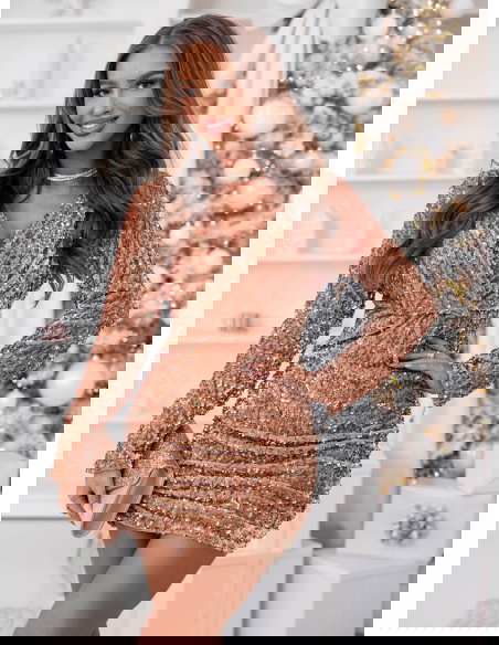 Złota cekinowa sukienka z przekładanym dekoltem Leewitt to kwintesencja blasku, elegancji i kobiecego wdzięku. Jej mieniąca się powierzchnia przyciąga spojrzenia i doskonale wpisuje się w klimat wyjątkowych, świątecznych i wieczorowych okazji. To model, który łączy w sobie luksusowy charakter z subtelną zmysłowością. Dopasowany krój pięknie podkreśla figurę, a przekładany dekolt dodaje delikatności i eleganckiego uroku. Długie rękawy równoważą błyszczący materiał, nadając całości wyrafinowanego charakteru. To idealna propozycja dla kobiet, które lubią wyglądać stylowo i olśniewająco. Złoty kolor podkreśla ciepło i pewność siebie, tworząc wyjątkowy efekt pełen szyku. W tej sukience każda kobieta poczuje się wyjątkowo, niezależnie od okazji. To kreacja, która sprawia, że każda chwila nabiera blasku.