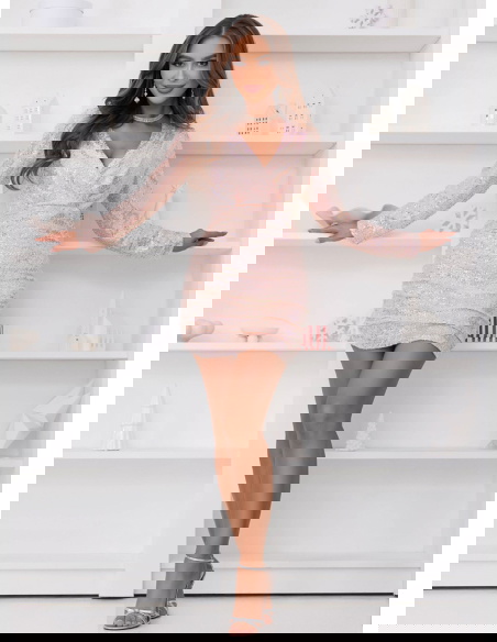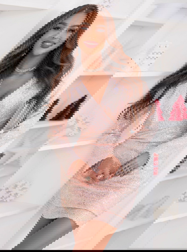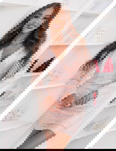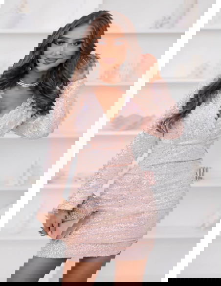 Pudrowa cekinowa świąteczna sukienka z przekładanym dekoltem Marjeta -