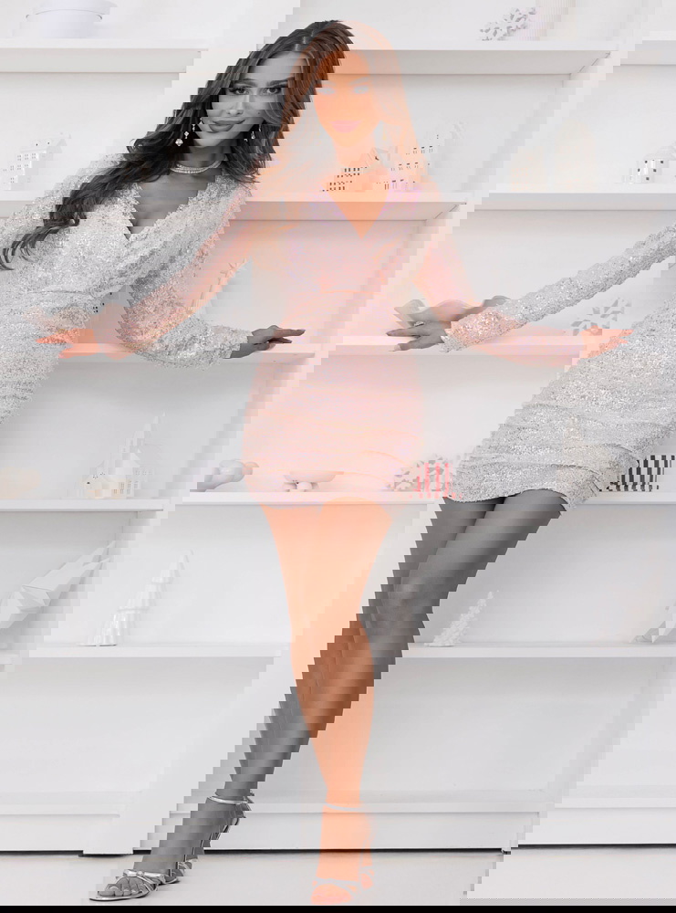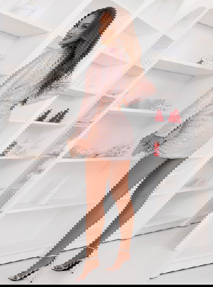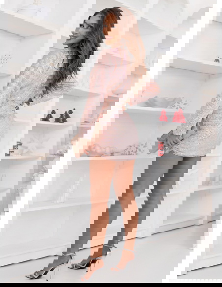 Pudrowa cekinowa sukienka z przekładanym dekoltem Marjeta świetnie sprawdzi się na świąteczne przyjęcia i zimowe uroczystości. To idealny wybór na wieczorne wyjścia, kolacje czy eleganckie spotkania.