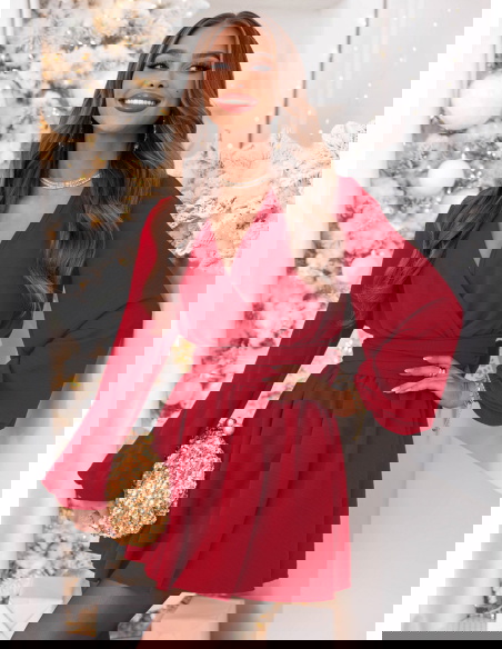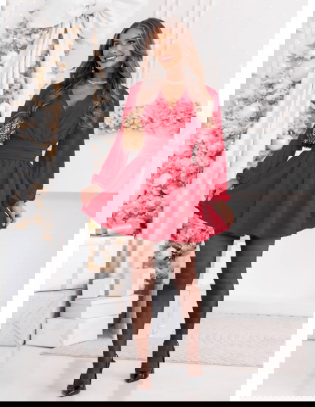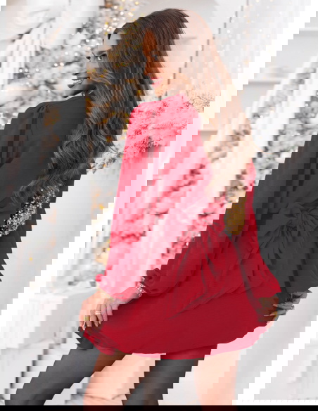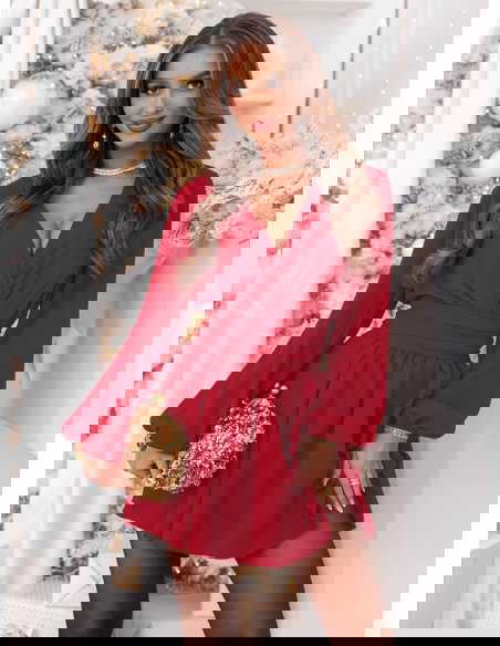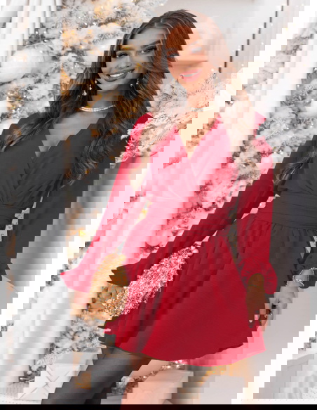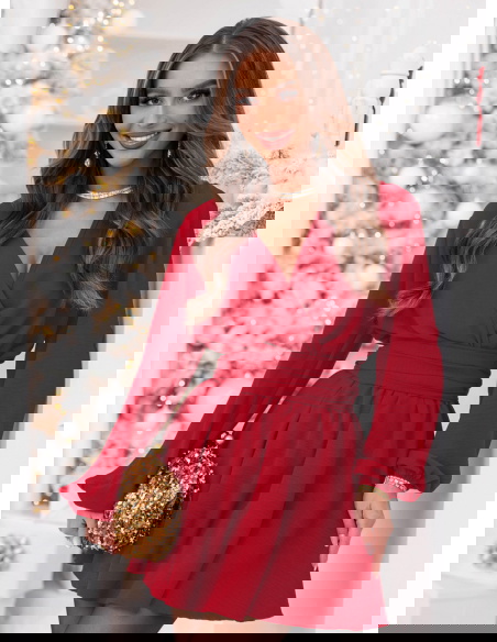 Malinowy kombinezon jak sukienka na święta z bufiastymi rękawami Luinda