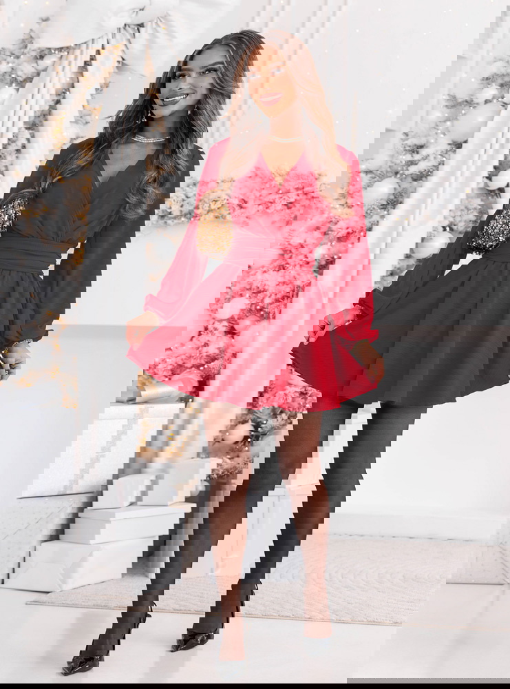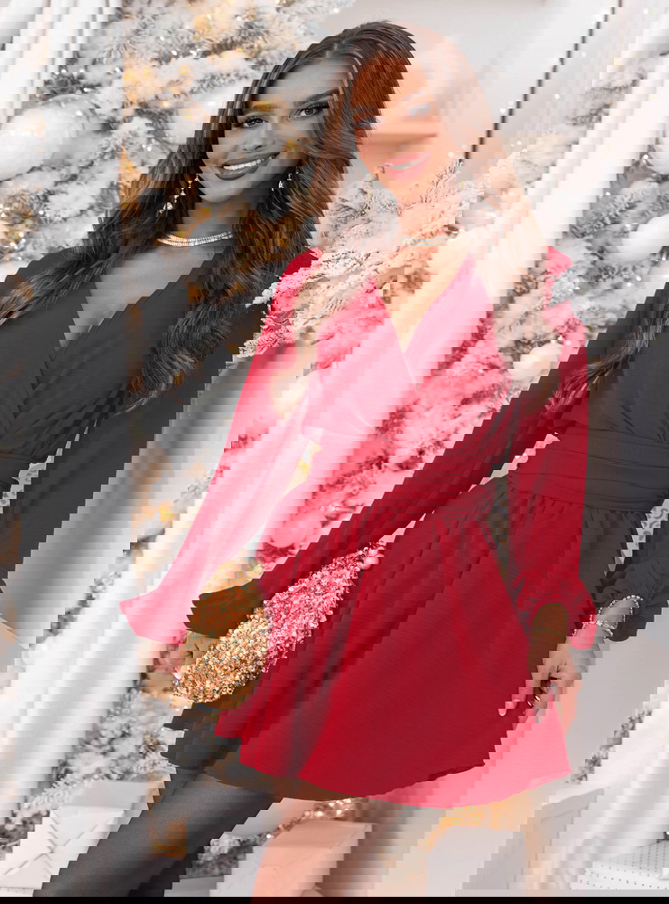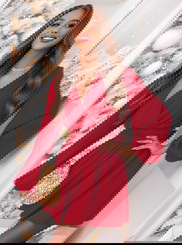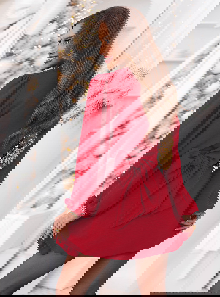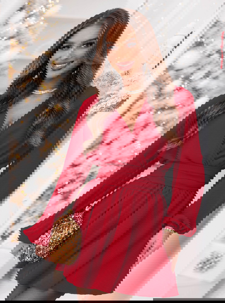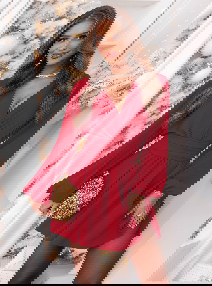 Malinowy kombinezon jak sukienka z bufiastymi rękawami Luinda świetnie sprawdzi się na świąteczne uroczystości i rodzinne spotkania. To idealny wybór na zimowe przyjęcia, eleganckie kolacje czy wyjścia do restauracji.