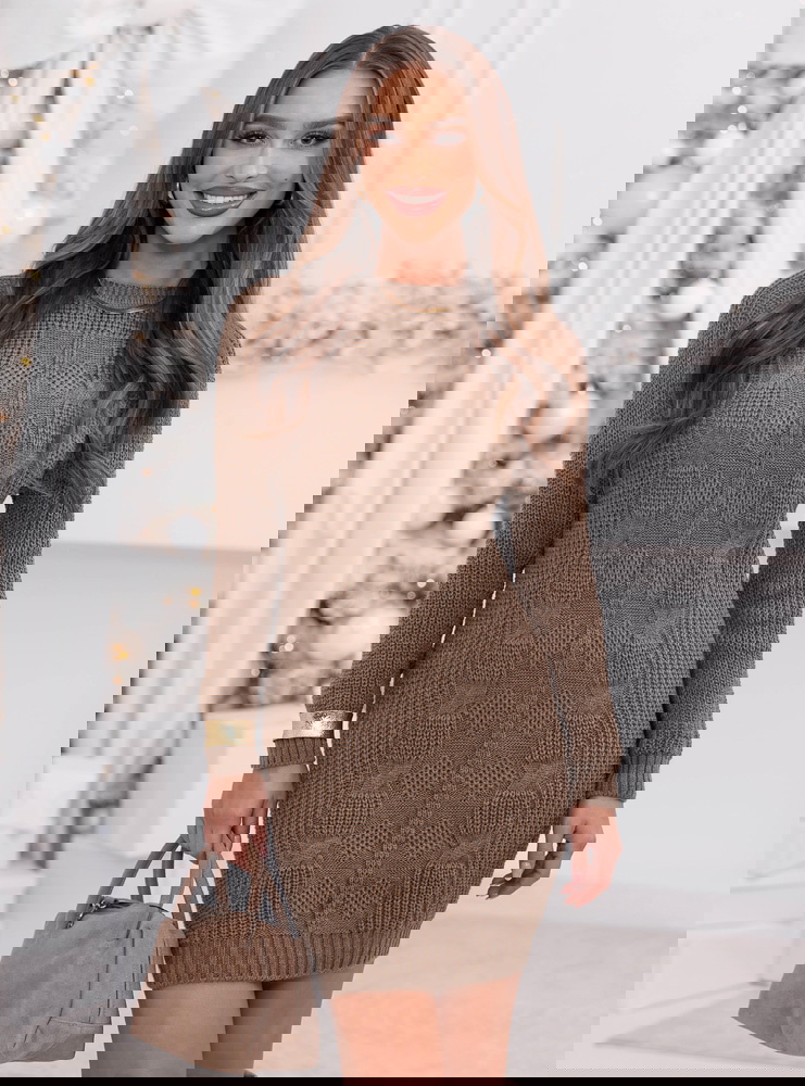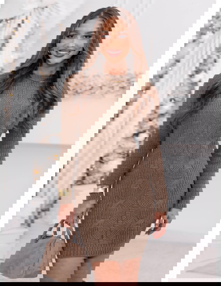Sweterowa sukienka z ozdobnym splotem Nijolee - mocha mousse zachwyca eleganckim splotem, który dodaje jej struktury i wyjątkowego uroku.