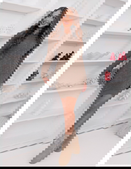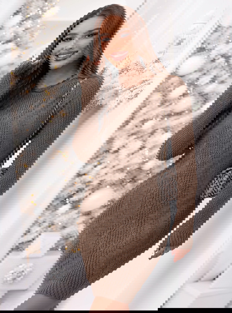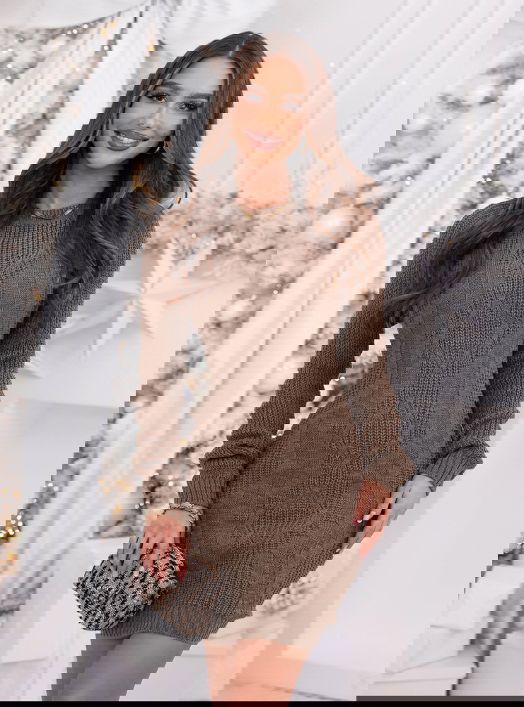 Swetrowa sukienka mini Beverlee - mocha mousse to propozycja, która idealnie wpisuje się w jesienny, otulający klimat. To model, który już na pierwszy rzut oka zachwyca swoim ciepłym odcieniem i delikatną, kobiecą linią. Jej przyjemna forma sprawia, że pięknie układa się na sylwetce, dodając lekkości i swobody. Ozdobny splot podkreśla charakter sukienki, nadając jej subtelnie wyrazistego akcentu. To świetny wybór na chłodniejsze dni, kiedy chcesz wyglądać stylowo i jednocześnie czuć się komfortowo. W połączeniu z ulubionymi botkami lub kozakami stworzy jesienny zestaw, który trudno będzie przeoczyć.