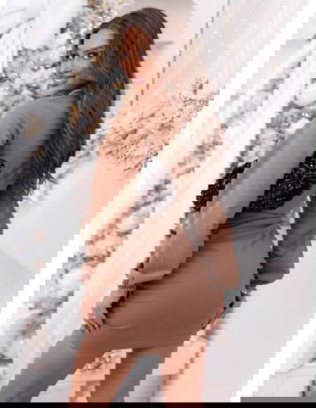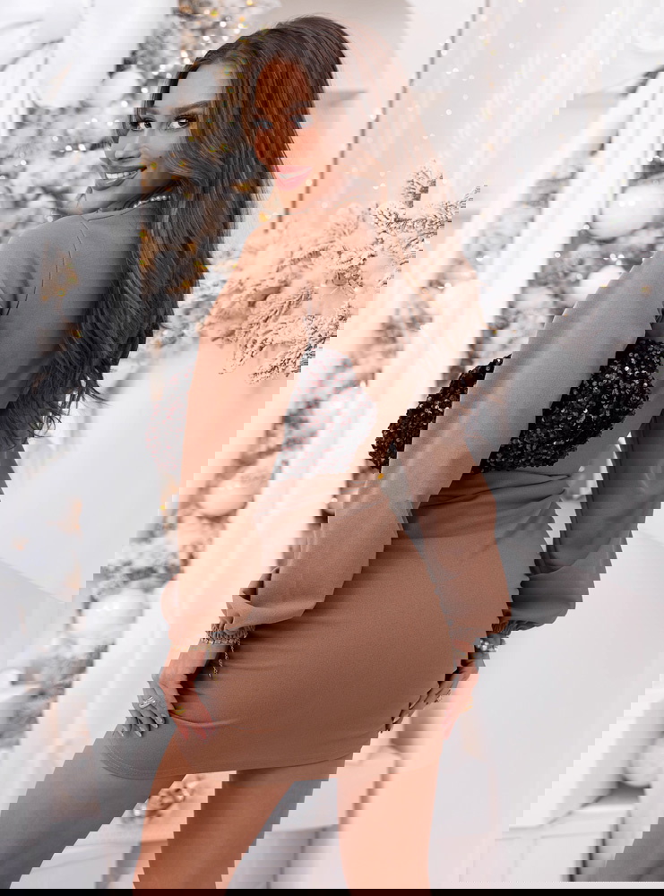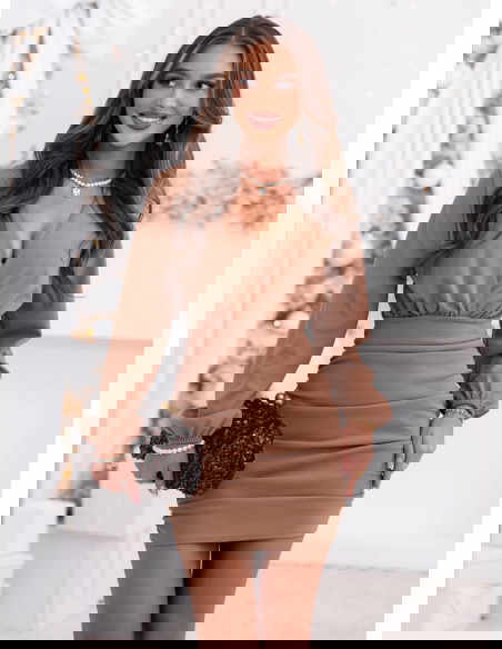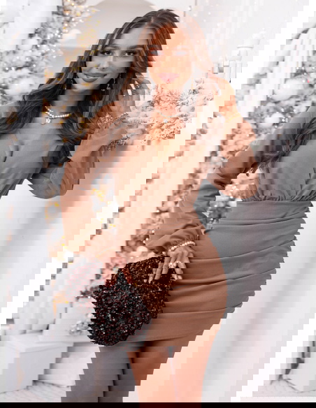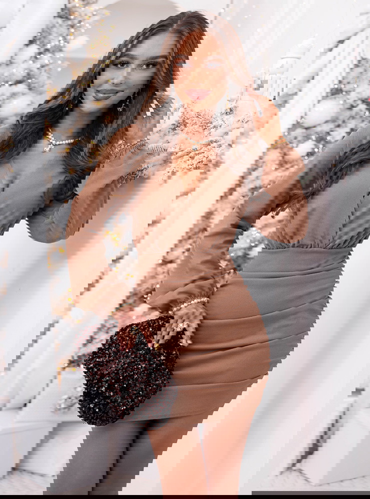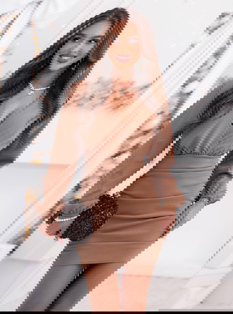 Sukienka mini z przekładanym dekoltem Jasqua - mocha mousse doskonale sprawdzi się na zimowe przyjęcia, świąteczne kolacje i eleganckie spotkania. To idealny wybór również na randkę, wieczorne wyjście do restauracji czy bardziej uroczyste wydarzenia.