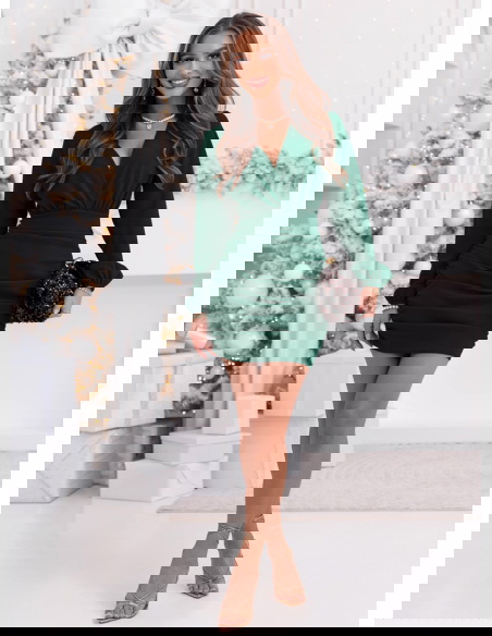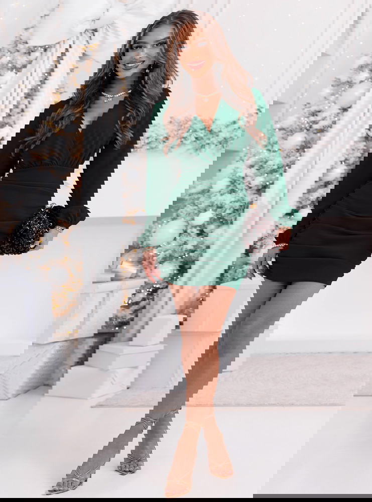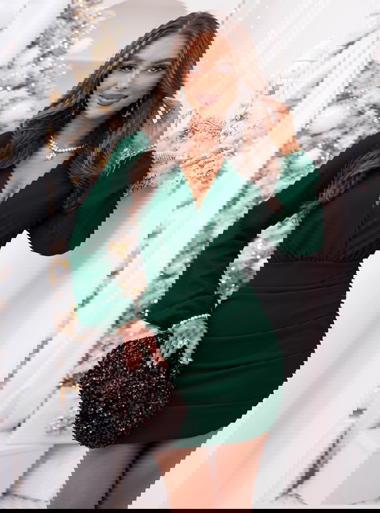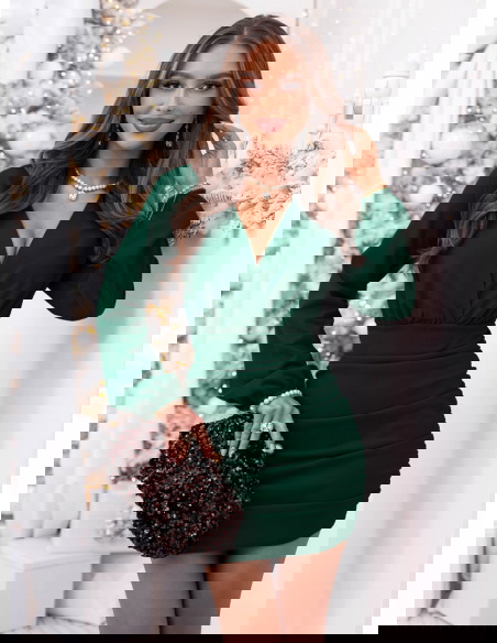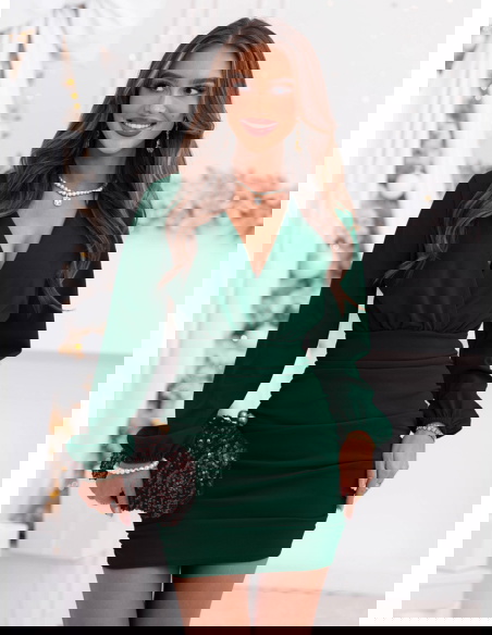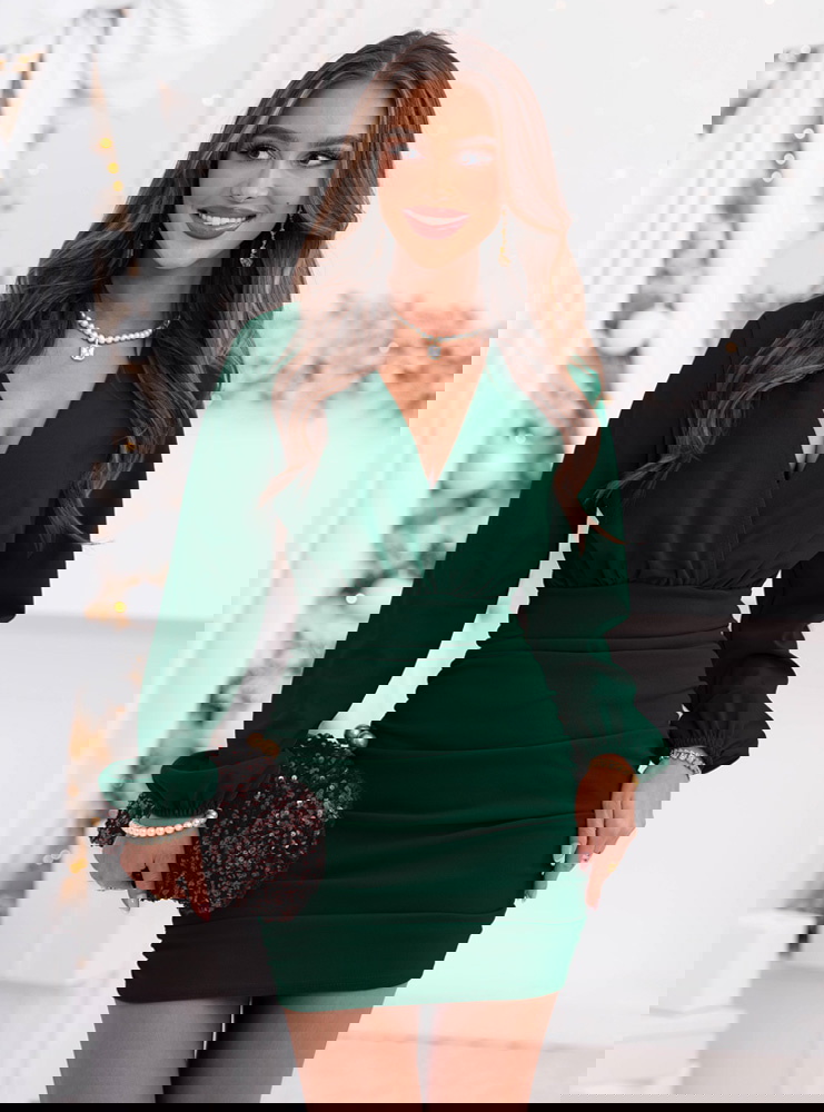 Sukienka mini z przekładanym dekoltem Jasqua - butelkowa zieleń to idealna propozycja na wyjątkowe chwile. Świetnie sprawdzi się podczas świątecznych przyjęć, kolacji, randek czy wieczorowych wyjść.