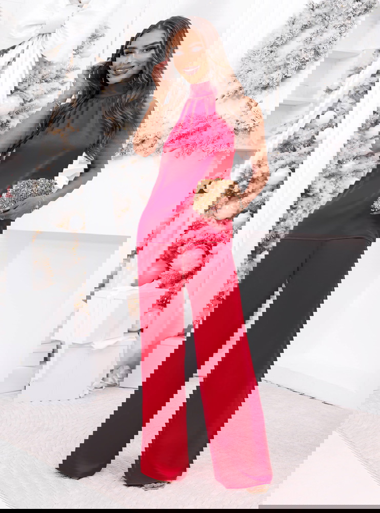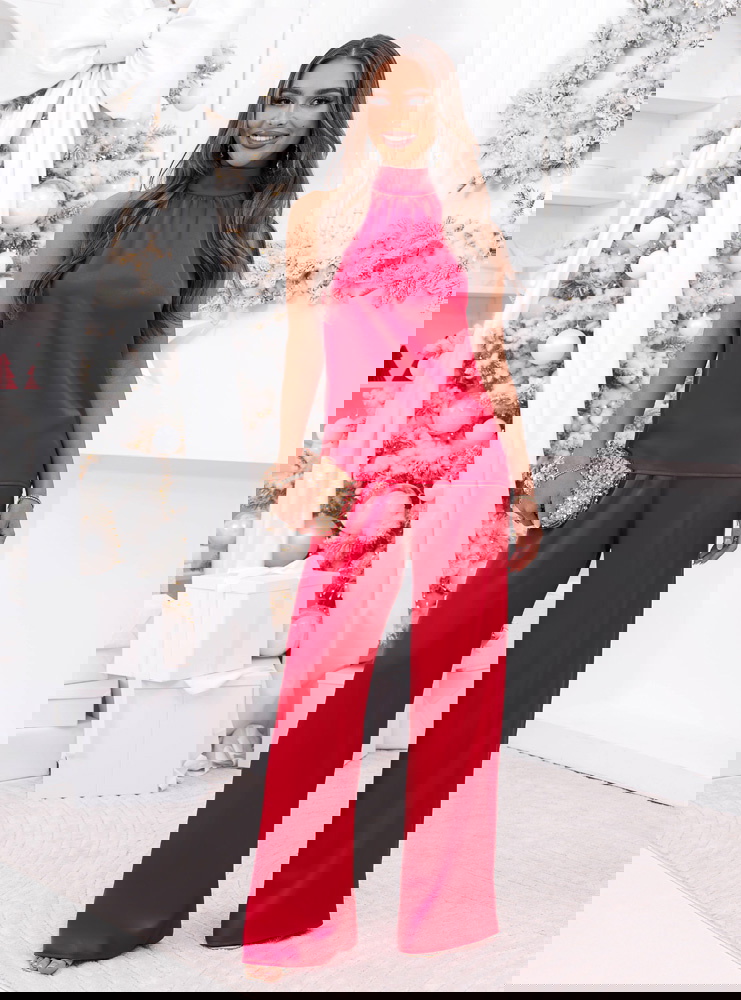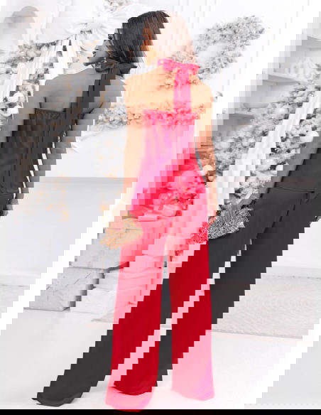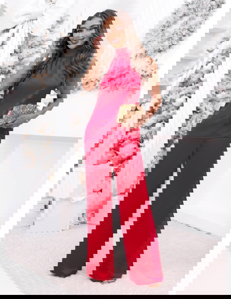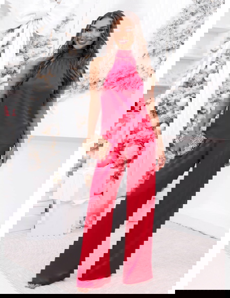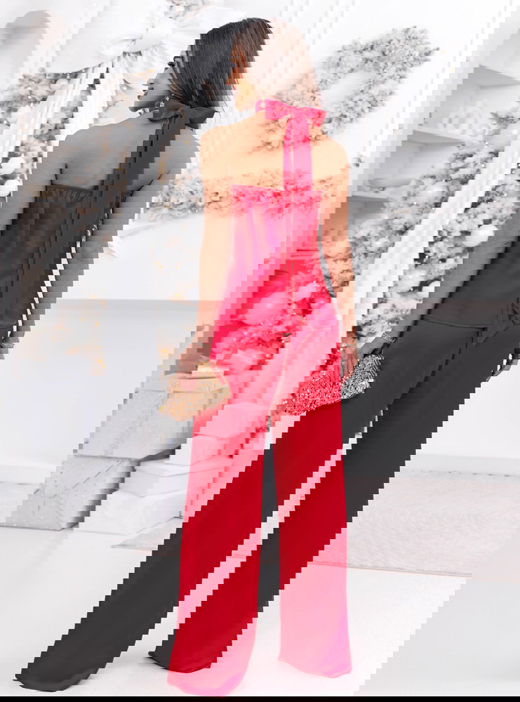 Malinowy satynowy świąteczny komplet bluzka z wiązaniem i szerokie spodnie Marteisha