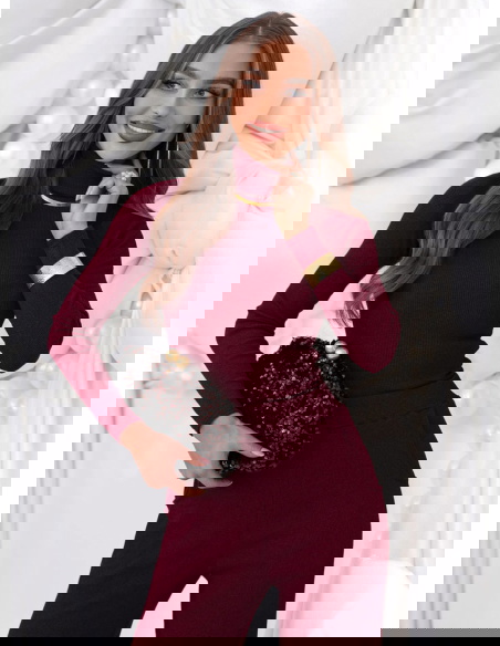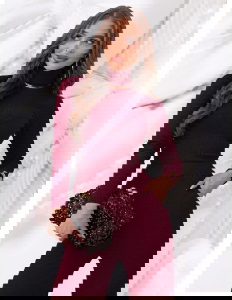 Bordowy prążkowany komplet bluzka z golfem i spodnie Clarencia świetnie sprawdzi się na zimowe spotkania i świąteczne okazje. To doskonały wybór na elegancką kolację, rodzinne wydarzenie oraz kameralne przyjęcia.