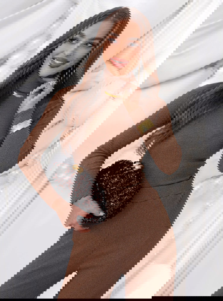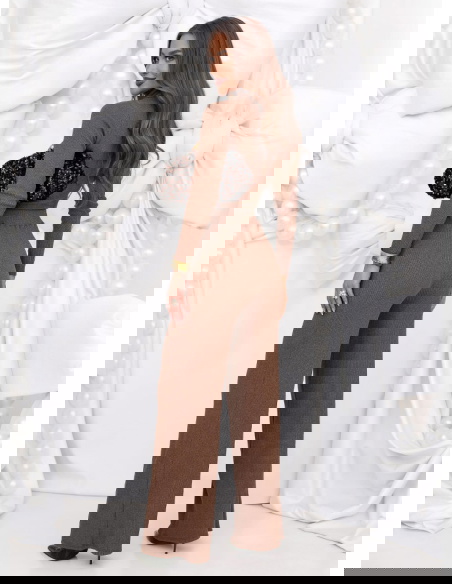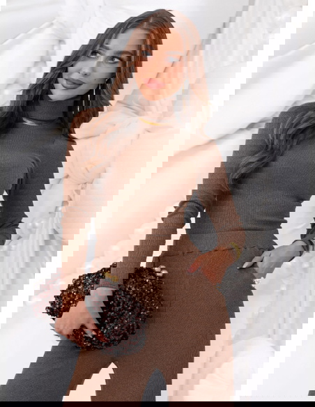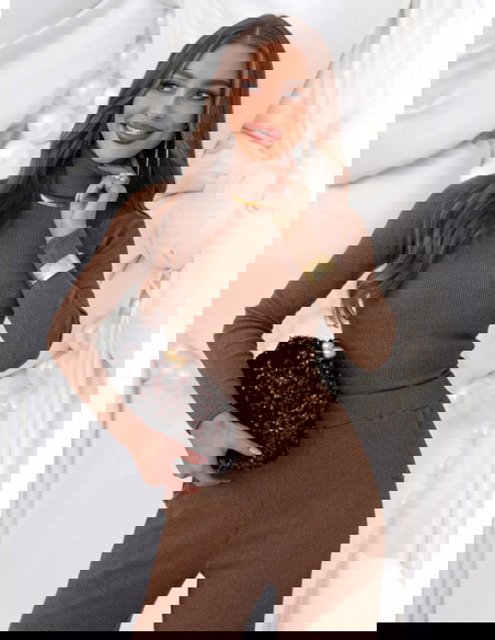 Prążkowany komplet bluzka z golfem i spodnie Clarencia - mocha mousse to stylowa propozycja dla kobiet ceniących elegancję w wygodnym wydaniu. To zestaw, który doskonale łączy klasykę z nowoczesnością, tworząc efektowny look idealny na chłodniejsze dni. Ciepły, czekoladowy odcień dodaje stylizacji głębi i przytulnego charakteru, idealnie wpisując się w jesienno-zimowe trendy. Dopasowana bluzka z golfem subtelnie podkreśla sylwetkę, a przy tym prezentuje się wyjątkowo elegancko. Spodnie o szerokich nogawkach zapewniają komfort i swobodę ruchów, jednocześnie optycznie wydłużając nogi. To połączenie, które świetnie sprawdzi się zarówno w codziennych, jak i bardziej eleganckich stylizacjach. Komplet prezentuje się lekko, stylowo i z klasą – idealny wybór na sezon pełen spotkań i wyjątkowych chwil. W tej stylizacji elegancja idzie w parze z wygodą, tworząc efekt, który przyciąga uwagę.