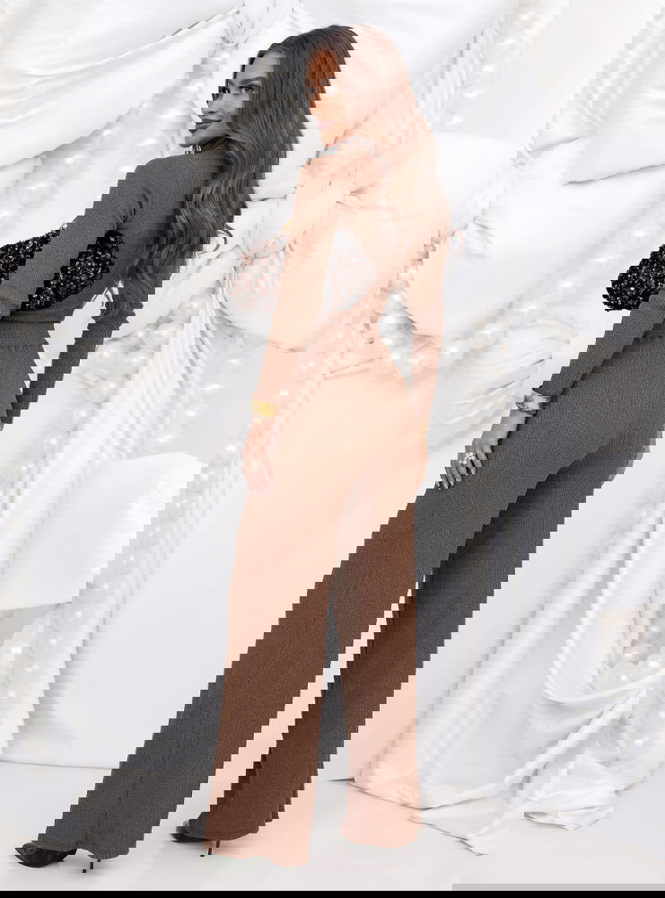Prążkowany komplet bluzka z golfem i spodnie Clarencia - mocha mousse to połączenie elegancji, wygody i ponadczasowego stylu. Jego krój podkreśla sylwetkę, a jednocześnie zapewnia pełen komfort noszenia. Ciepły, neutralny kolor sprawia, że łatwo dopasujesz go do innych elementów garderoby.