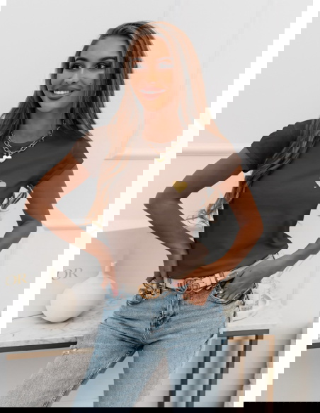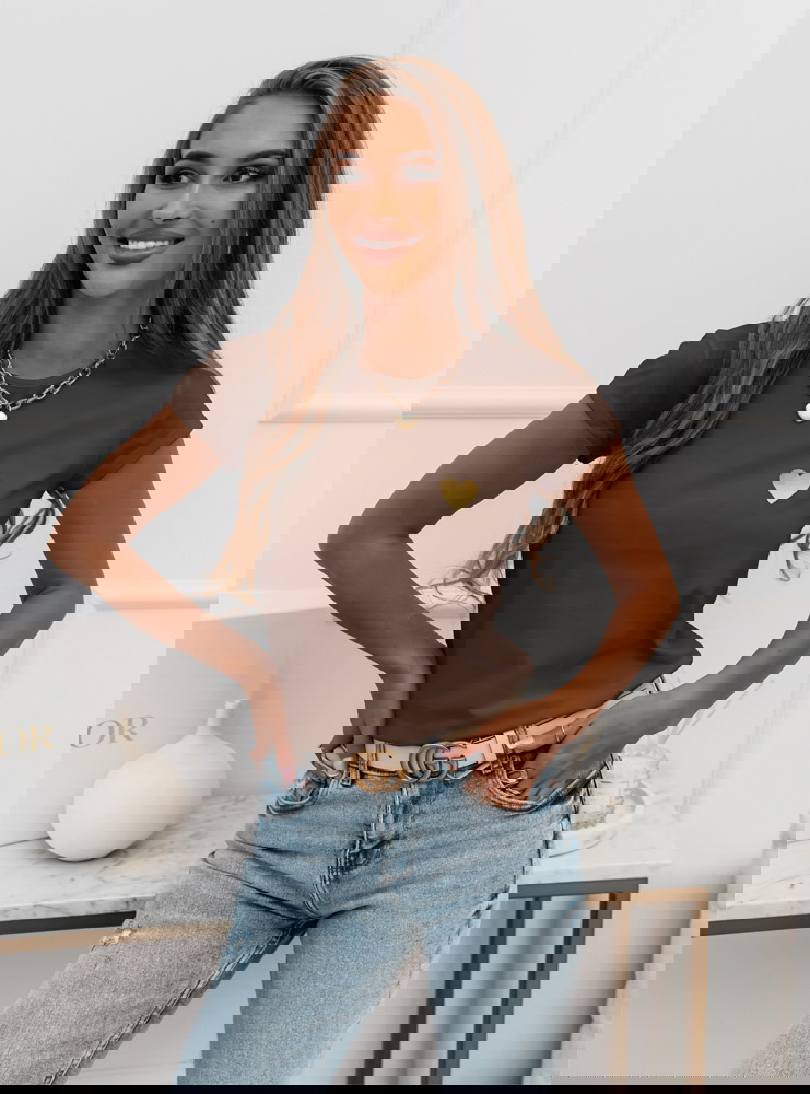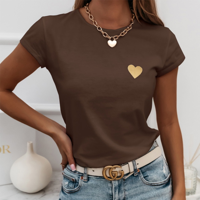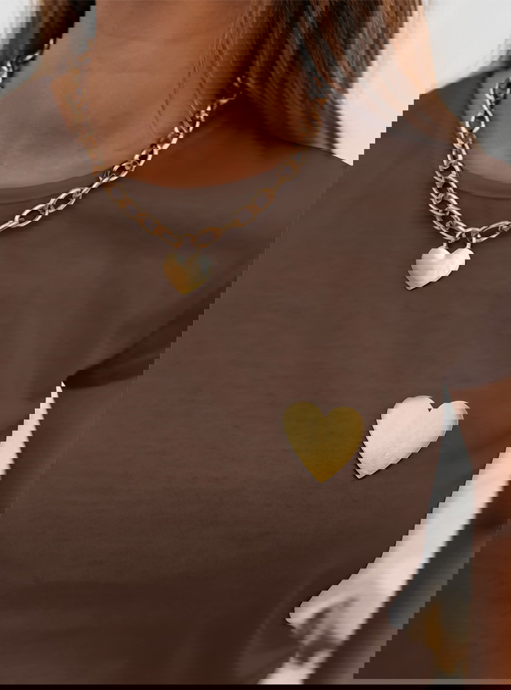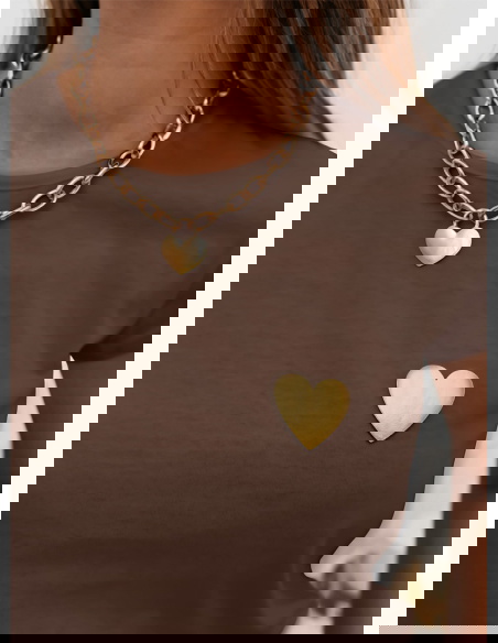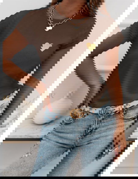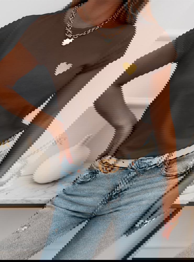 Czekoladowa koszulka na krótki rękaw z ozdobnym nadrukiem Kornekia to propozycja, która od pierwszej chwili zachwyca swoim prostym, a zarazem niezwykle stylowym charakterem. Jej czekoladowy odcień dodaje całości ciepła, tworząc idealną bazę do jesienno-zimowych stylizacji. Krótki rękaw nadaje koszulce lekkości, dzięki czemu świetnie sprawdza się zarówno w codziennych zestawach, jak i w bardziej dopracowanych outfitach. Subtelny nadruk w kształcie serca wyróżnia się na tle jednolitej koszulki, dodając jej dziewczęcego i modnego akcentu. Fason układa się swobodnie, zapewniając wygodę i naturalny wygląd. To model, który pozwala poczuć się stylowo bez nadmiernego wysiłku. Delikatny połysk nadruku wprowadza wyjątkowy detal, który dopełnia całość. Koszulka świetnie komponuje się ze złotą biżuterią, podkreślając elegancki, ale wciąż casualowy charakter stylizacji. To idealna baza na wiele okazji – od miejskich spacerów po spotkania w swobodnym klimacie.