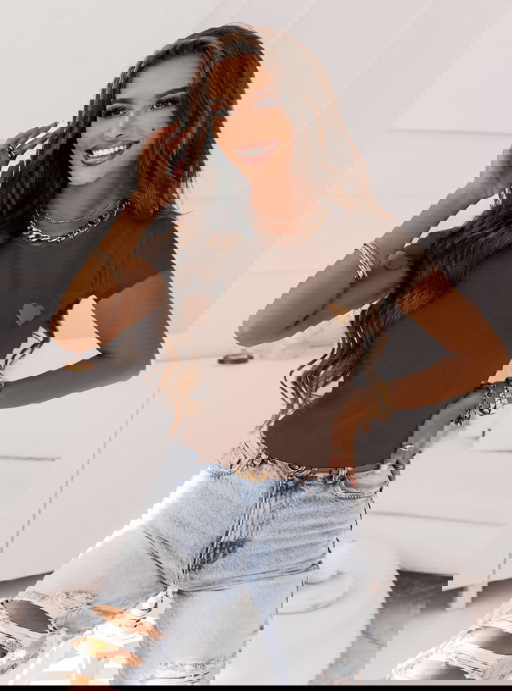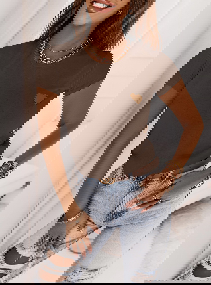 Czekoladowa koszulka na krótki rękaw z ozdobnym nadrukiem Belisimoo to świetny wybór na co dzień – do pracy, szkoły, na spotkania ze znajomymi czy zakupy. Doskonale sprawdzi się w casualowych stylizacjach z jeansami, ramoneską czy kardiganem.