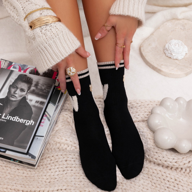 Czarne skarpetki z ozdobnym motywem Genice doskonale sprawdzą się w chłodniejsze dni, dodając stylizacjom delikatnej lekkości i przytulnego klimatu.