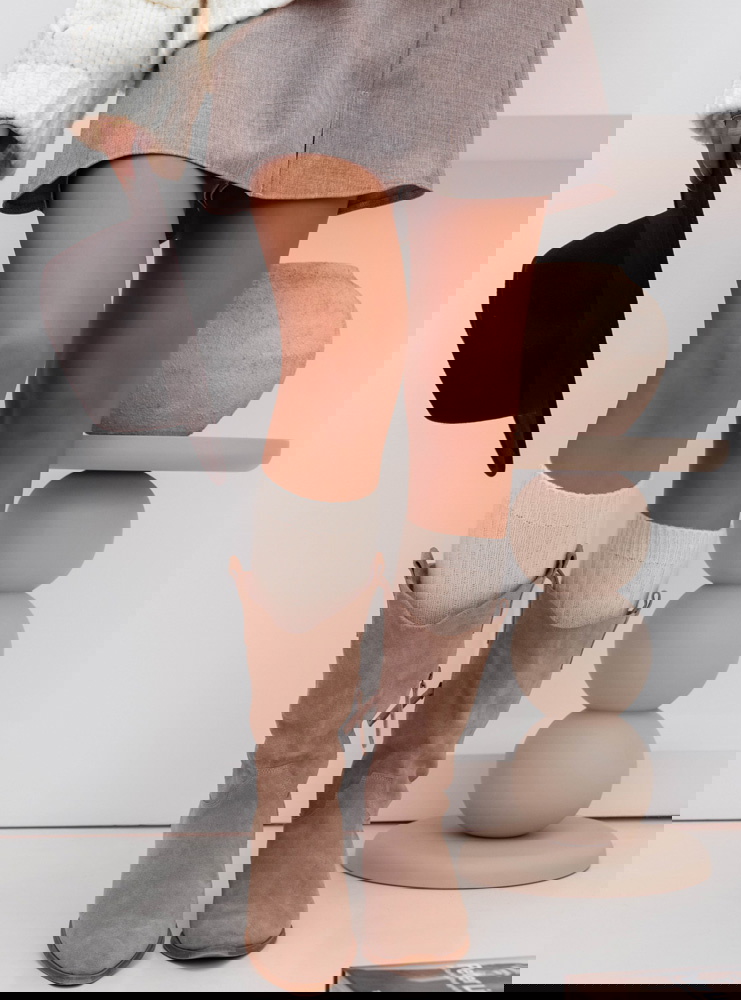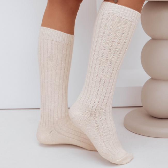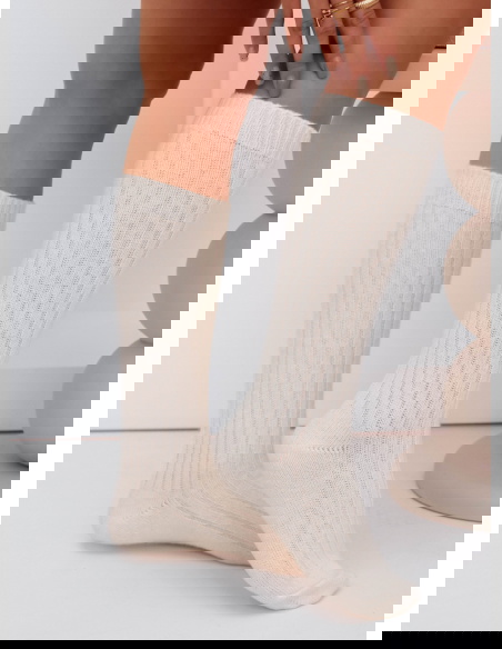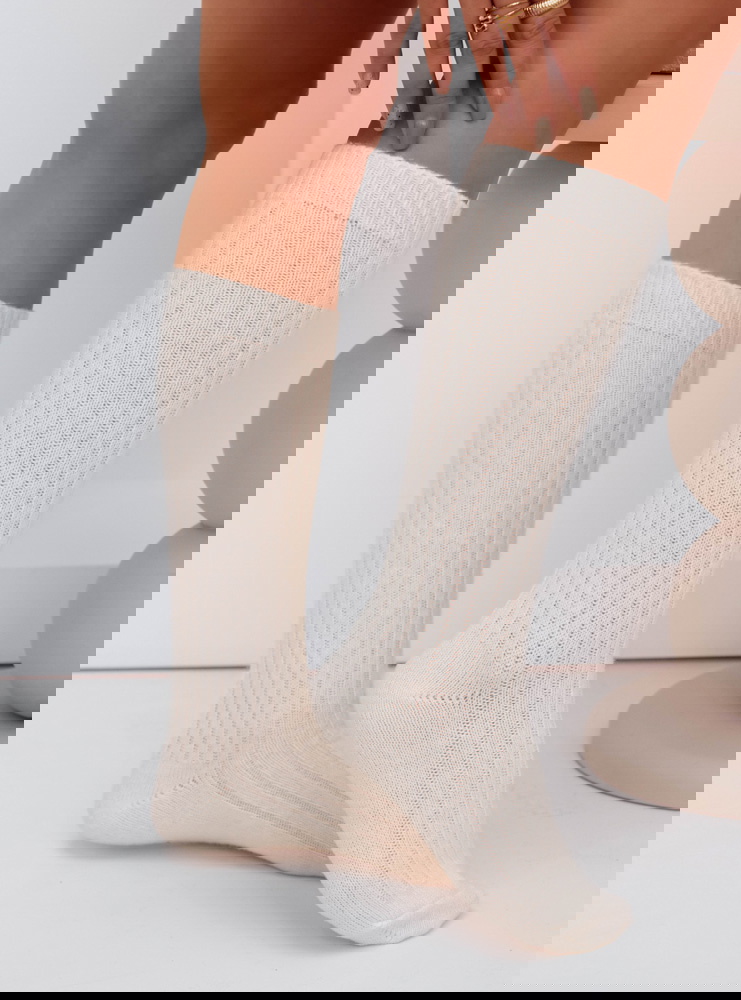 Podkolanówki prążkowane Russanna - ecru doskonale uzupełnią codzienne stylizacje, dodając im spójności i lekkiej elegancji.