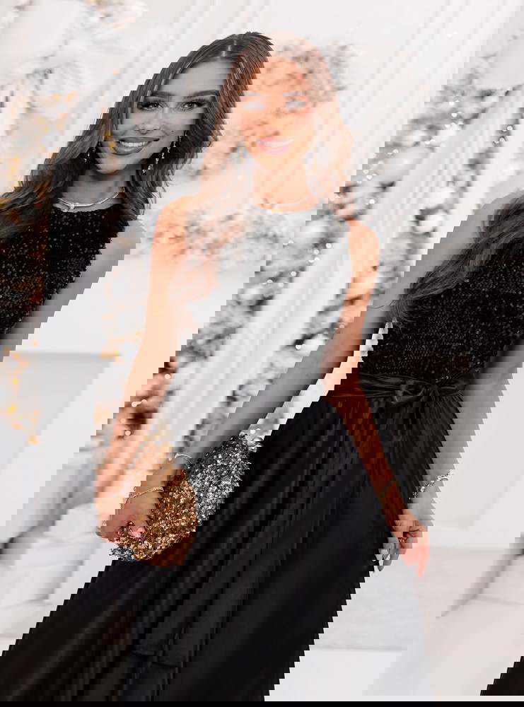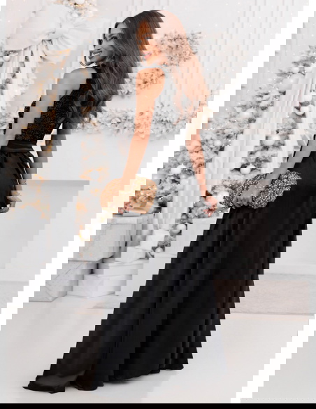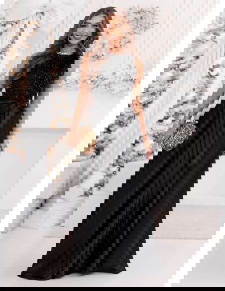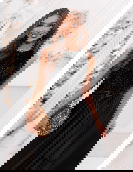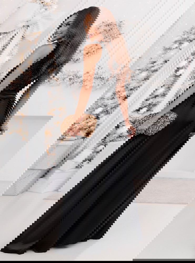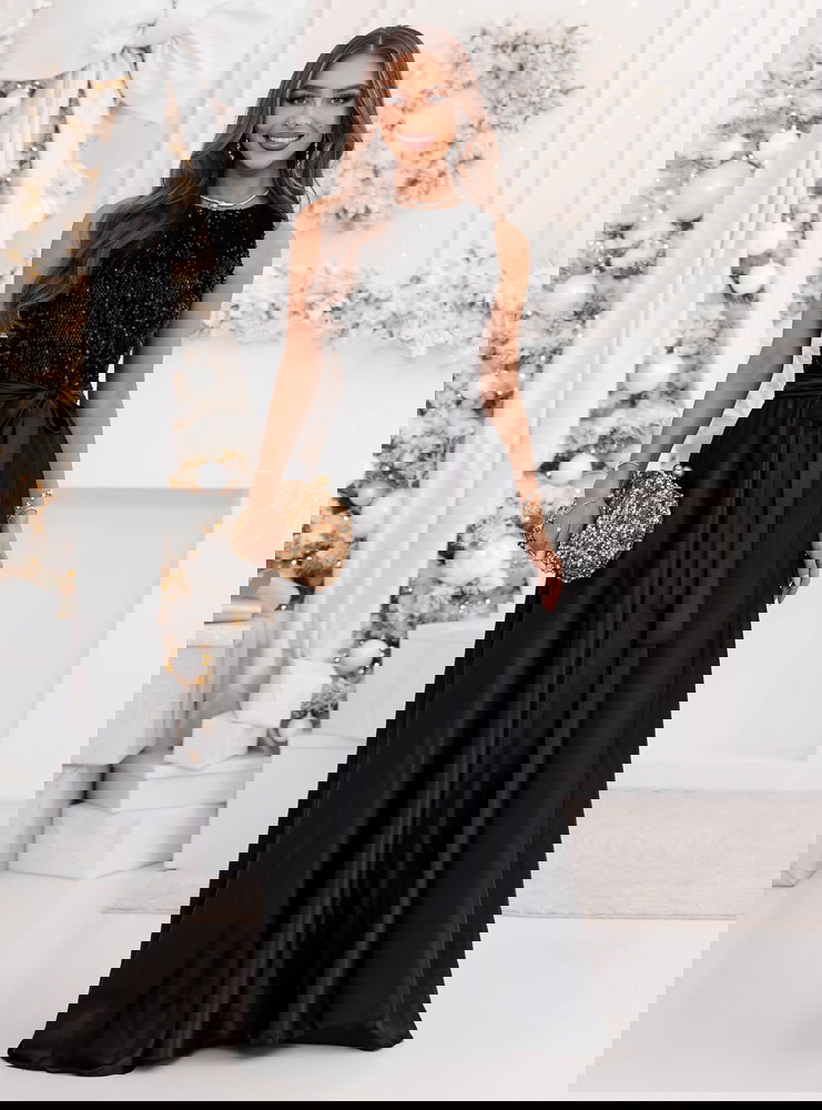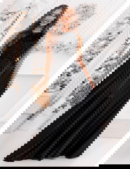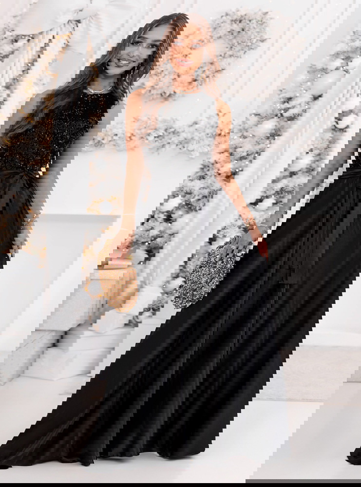 Czarna długa satynowa sukienka z cekinową górą Desina to idealny wybór na bale, gale, zimowe przyjęcia oraz świąteczne uroczystości. Doskonale sprawdzi się także podczas sylwestrowej nocy lub eleganckiej kolacji przy świecach.