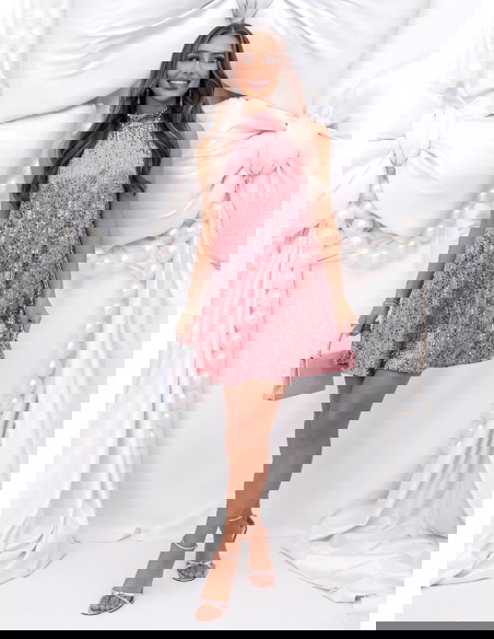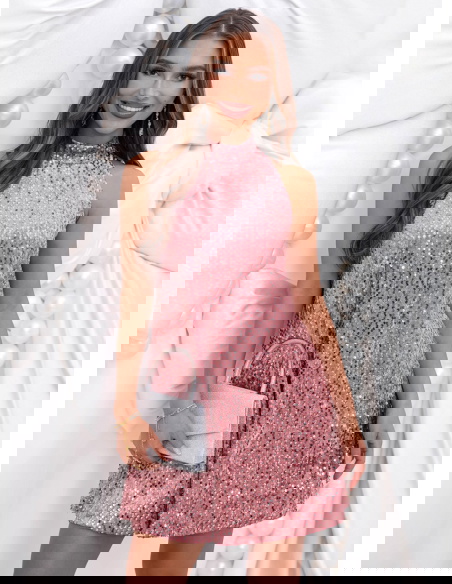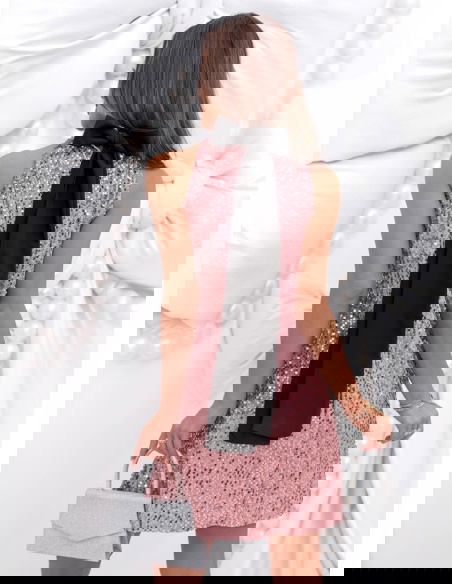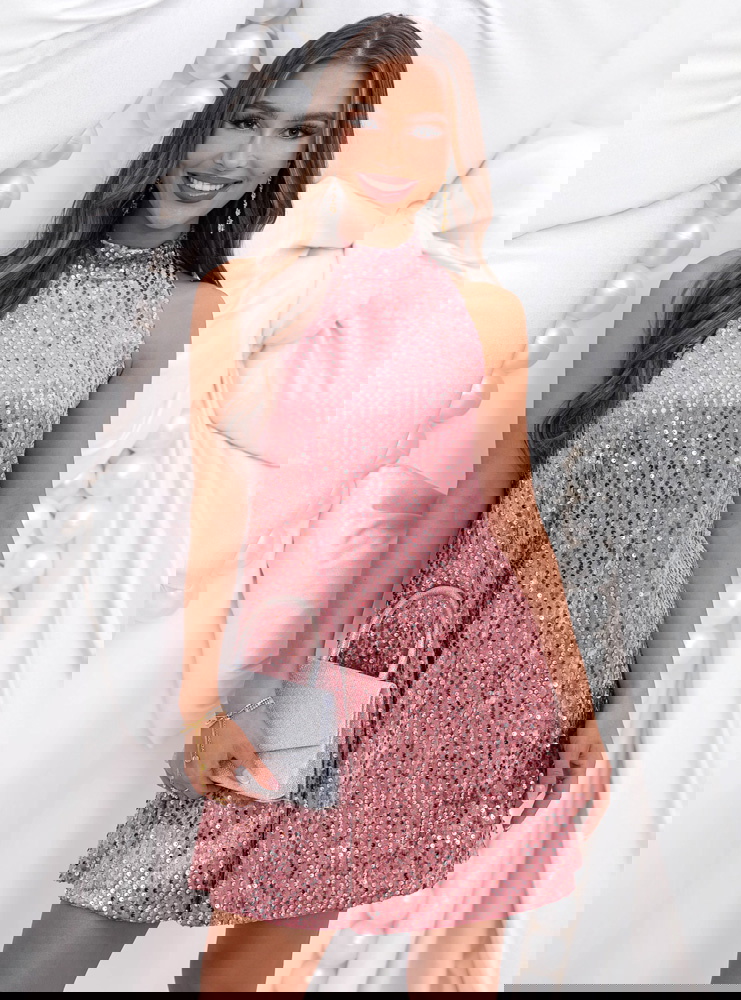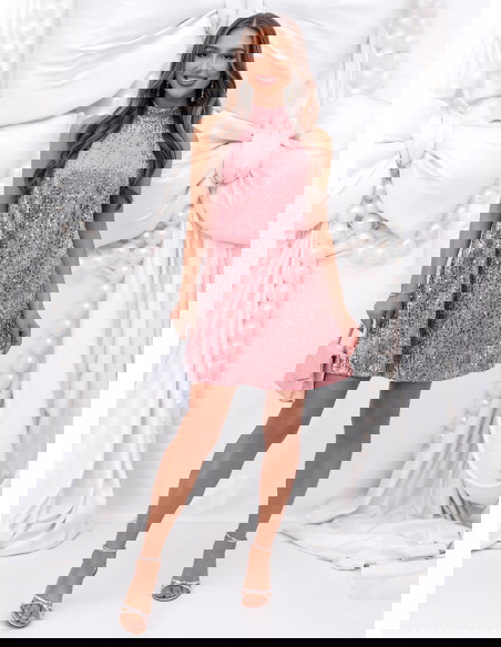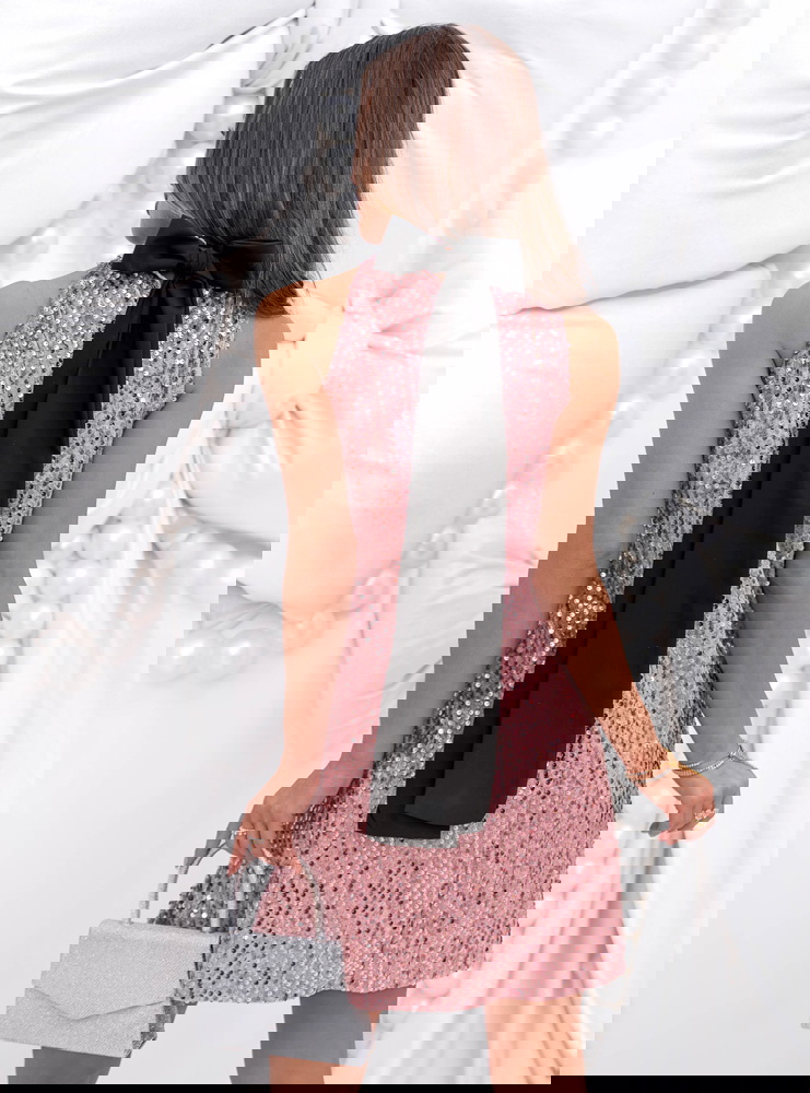 Cekinowa sukienka z kokardą Katrishaa - brudny róż to model stworzony z myślą o wyjątkowych okazjach. Jej błyszczące wykończenie przyciąga spojrzenia i nadaje kreacji wyrazistego charakteru.