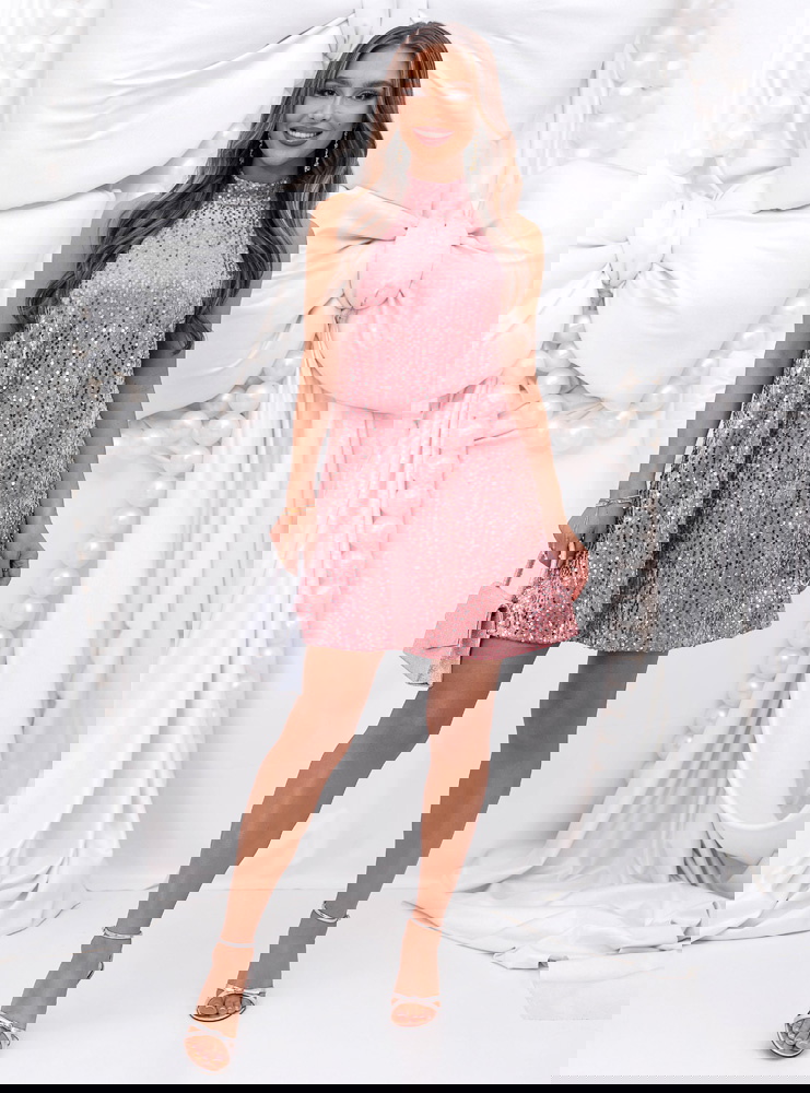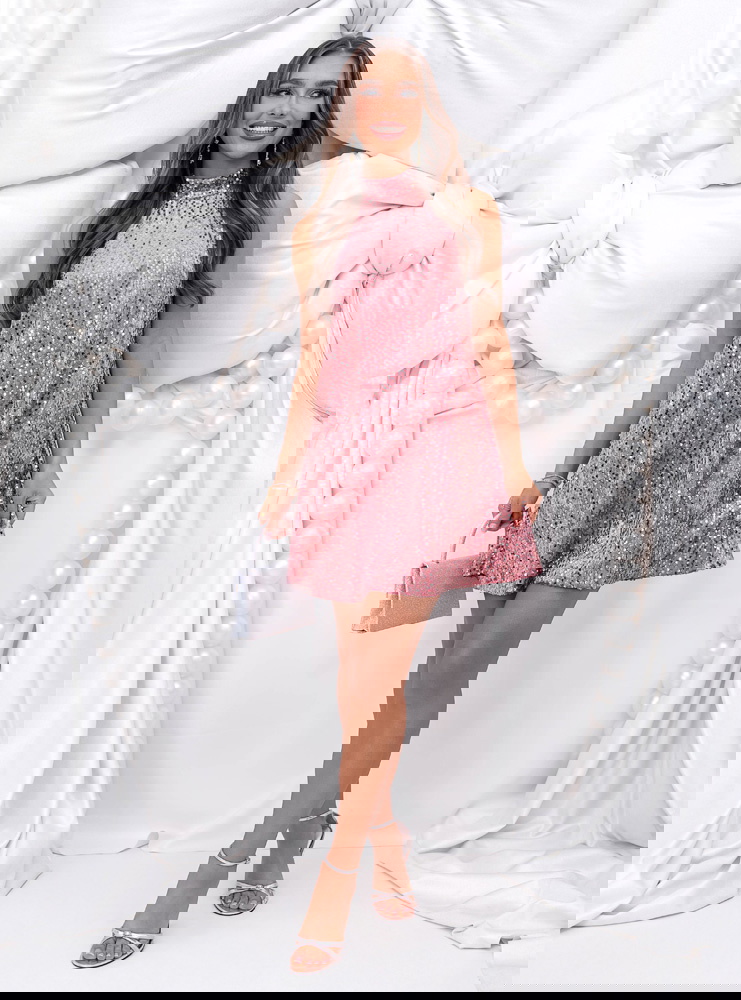Cekinowa sukienka z kokardą Katrishaa - brudny róż to propozycja, która od pierwszego spojrzenia zachwyca blaskiem i elegancją. Jej delikatnie rozkloszowany krój sprawia, że prezentuje się lekko i bardzo kobieco. Połyskujące cekiny pięknie odbijają światło, tworząc wyjątkowy efekt idealny na sezon zimowych uroczystości. Stójka przy dekolcie nadaje całości szykownego charakteru i lekko podkreśla linię szyi. Z tyłu uwagę przyciąga długa, dekoracyjna kokarda, która stanowi efektowny, biżuteryjny akcent. Sukienka subtelnie otula sylwetkę, jednocześnie pozostawiając swobodę ruchu. Jej fason sprawia, że doskonale sprawdzi się zarówno podczas tańca, jak i eleganckich kolacji. Brudnoróżowy odcień dodaje uroku i świetnie wpisuje się w świąteczno–zimowy klimat. To model, który pięknie łączy dziewczęcą świeżość z odrobiną wieczorowego glamour. Jeśli szukasz kreacji, która zrobi wrażenie i pozwoli poczuć się wyjątkowo — ta sukienka będzie idealnym wyborem.
