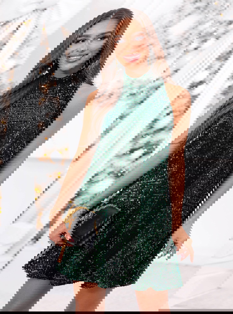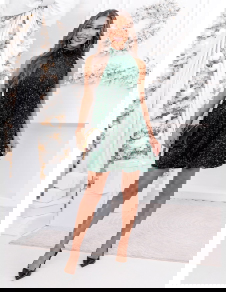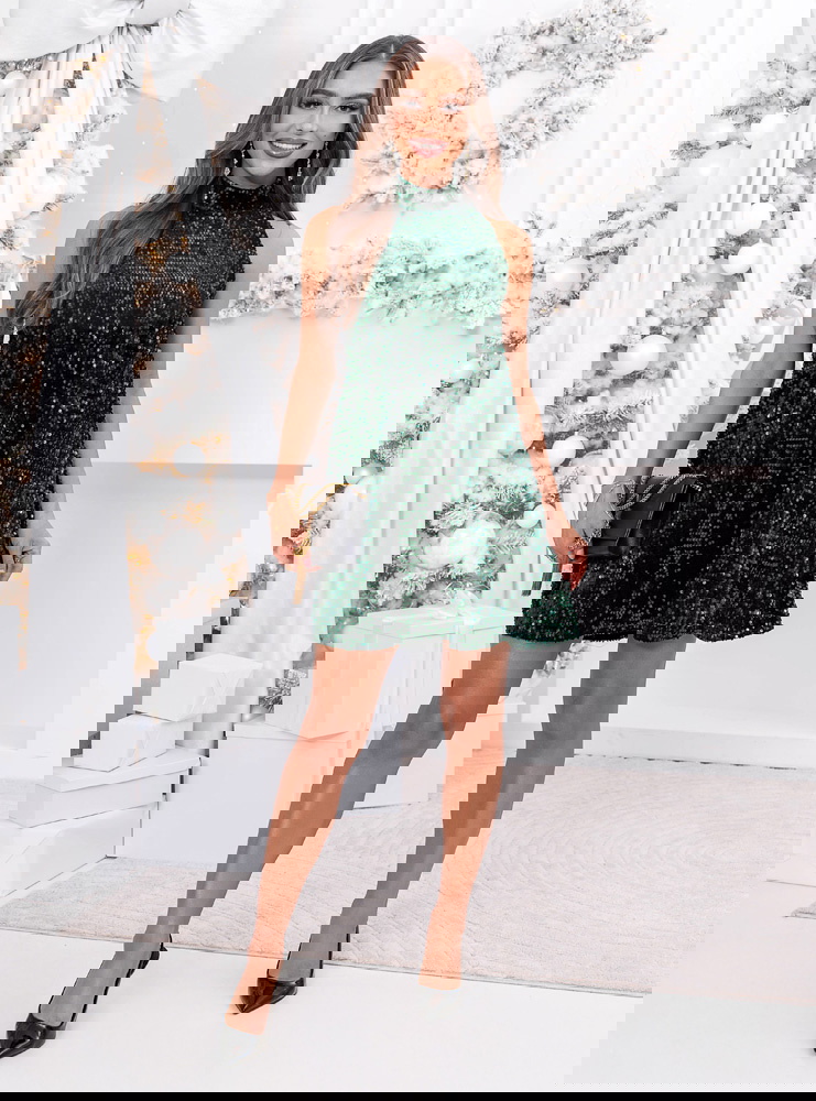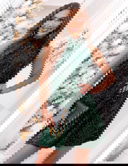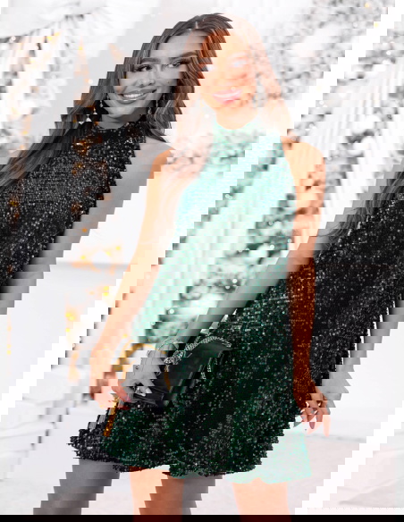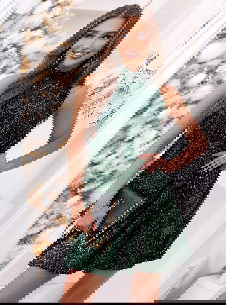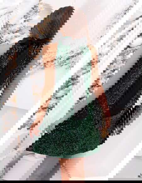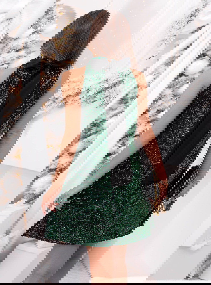 Cekinowa sukienka z kokardą Katrishaa - butelkowa zieleń to perfekcyjny wybór na wyjątkowe okazje — świąteczne przyjęcia, sylwestra, bal czy eleganckie kolacje. Świetnie komponuje się z klasycznymi szpilkami, małą torebką i delikatną biżuterią.