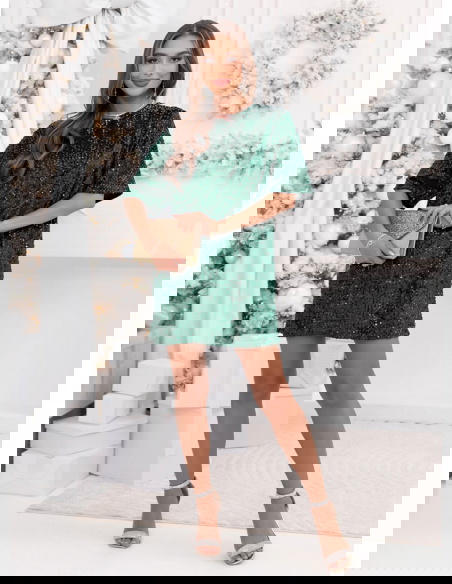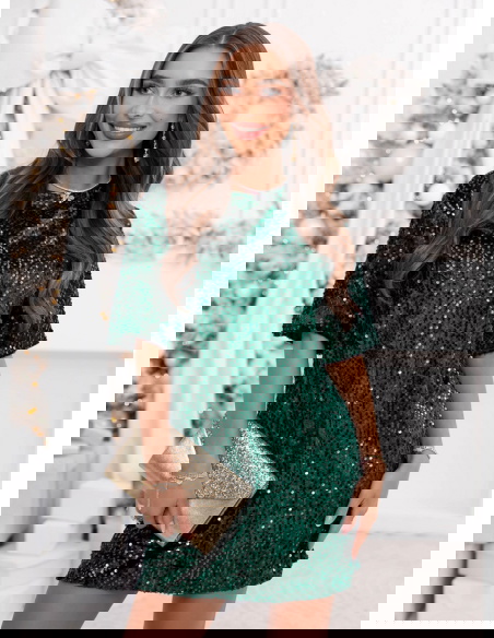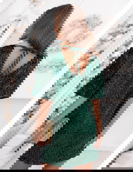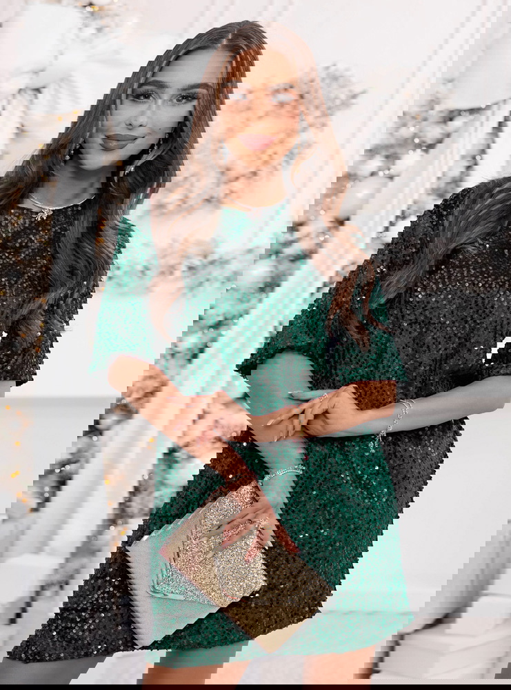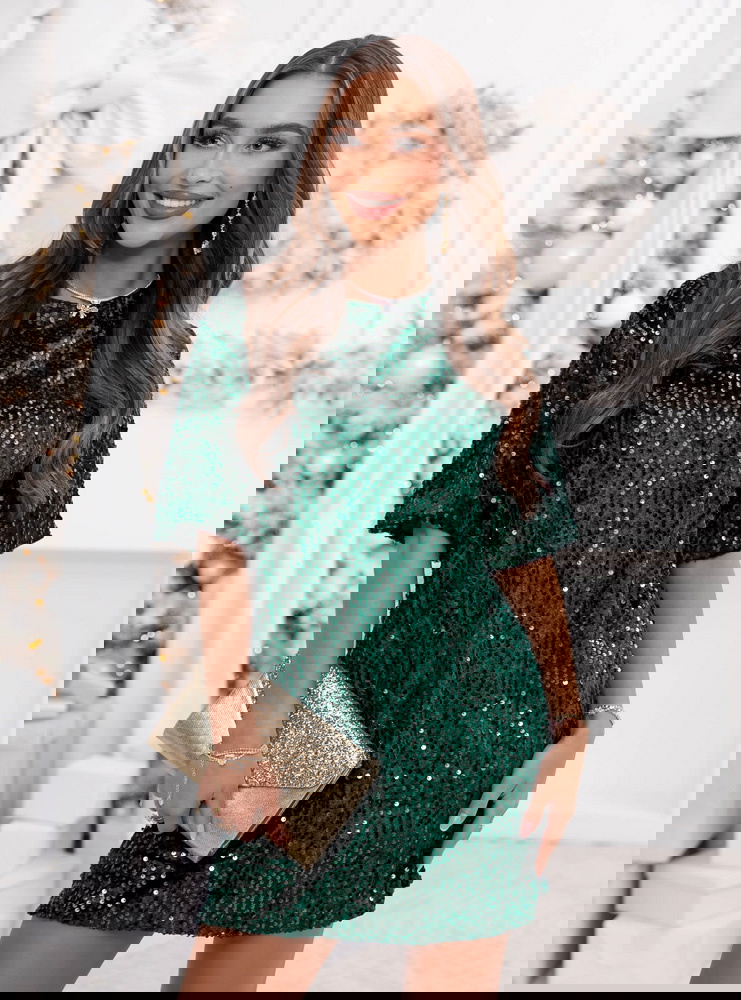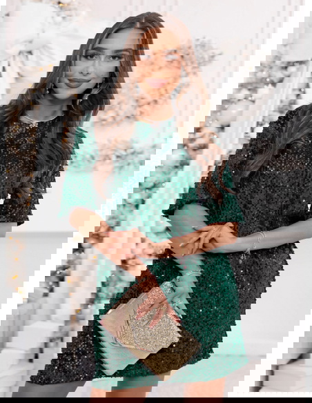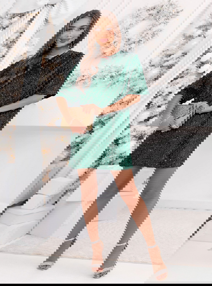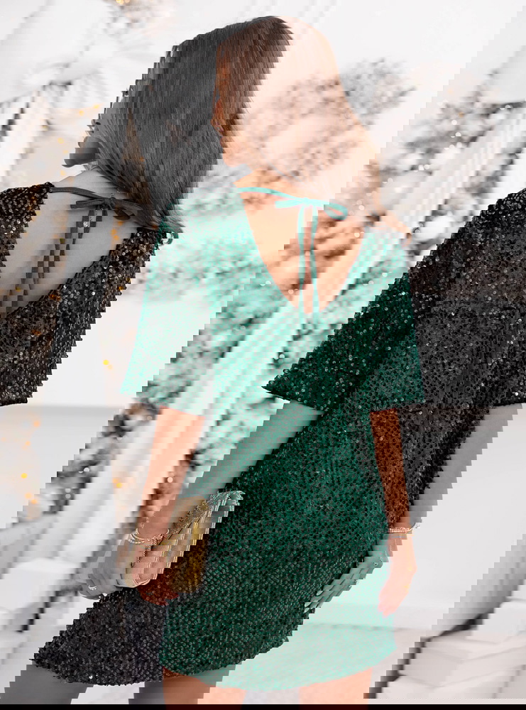 Cekinowa sukienka mini Mlindaa - butelkowa zieleń to idealna propozycja na wigilijne spotkania, świąteczne przyjęcia oraz eleganckie kolacje. Doskonale sprawdzi się także na sylwestrową noc, zapewniając efektowny, błyszczący look.
