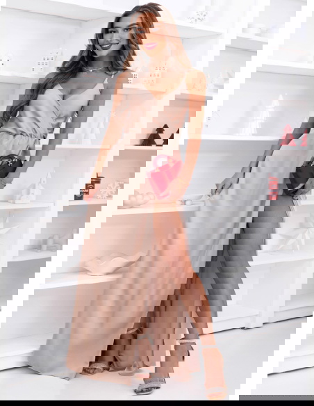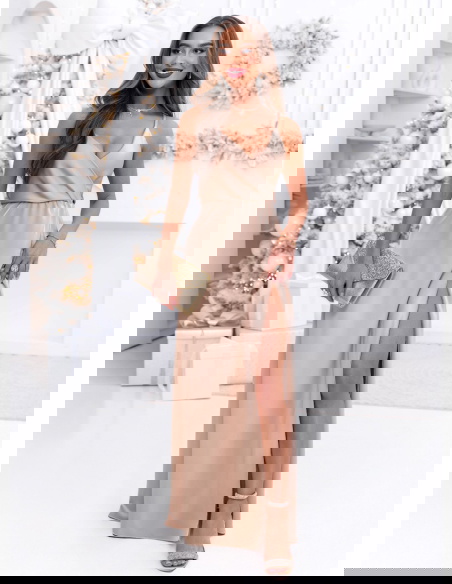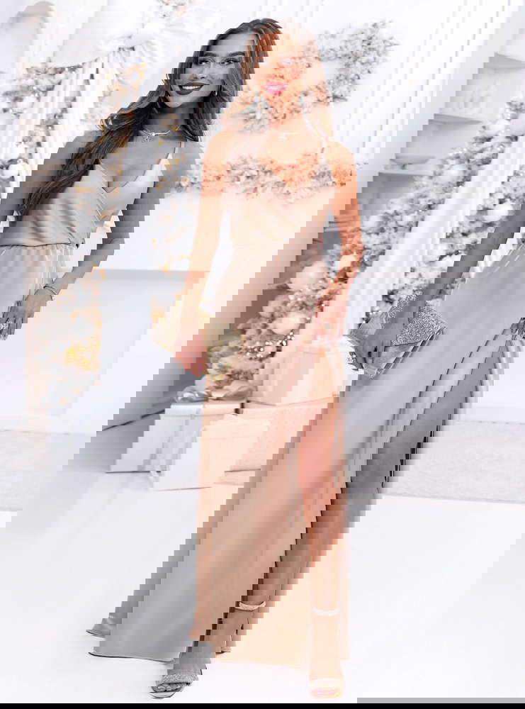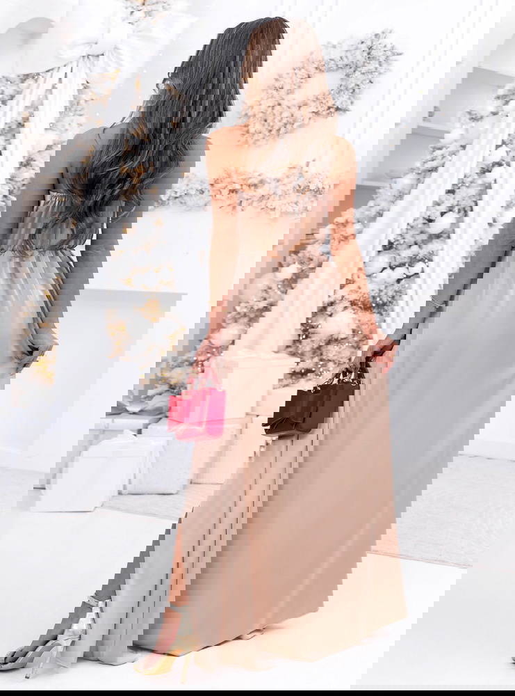 Beżowa świąteczna sukienka satynowa maxi na ramiączkach Linaevee