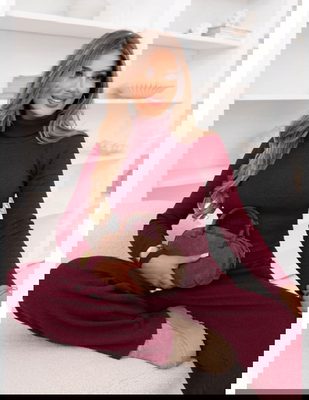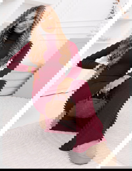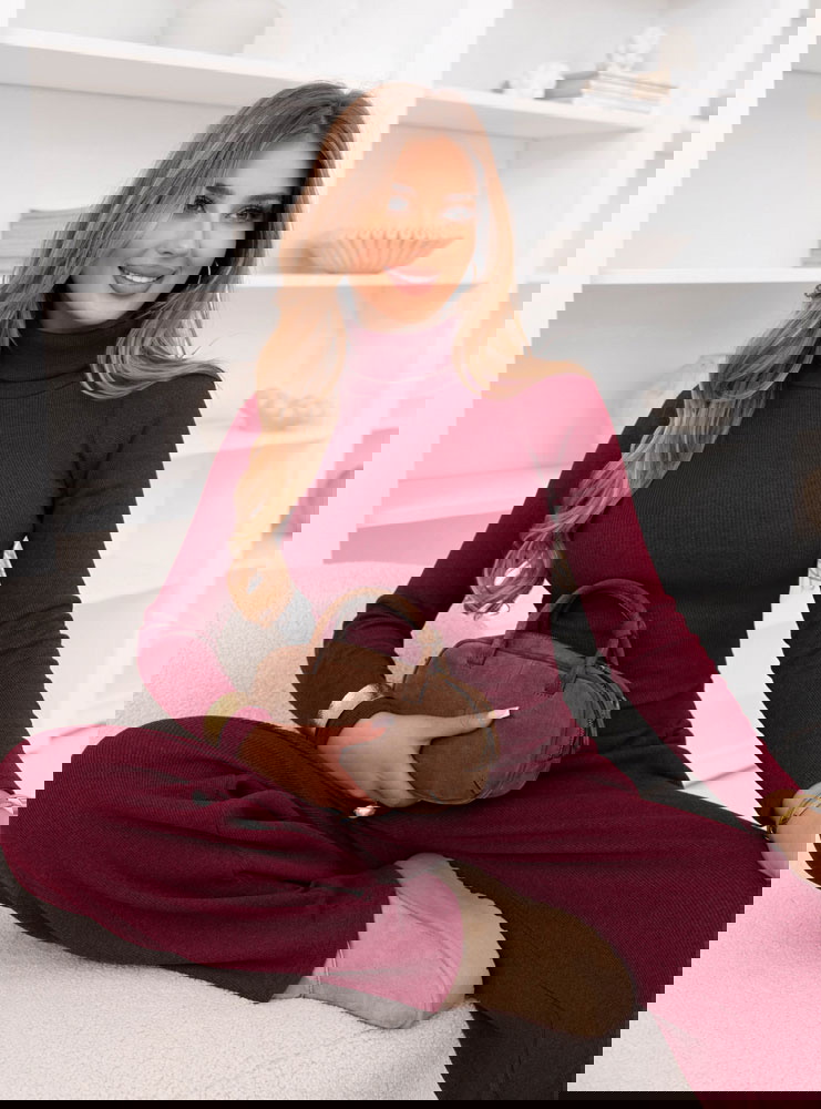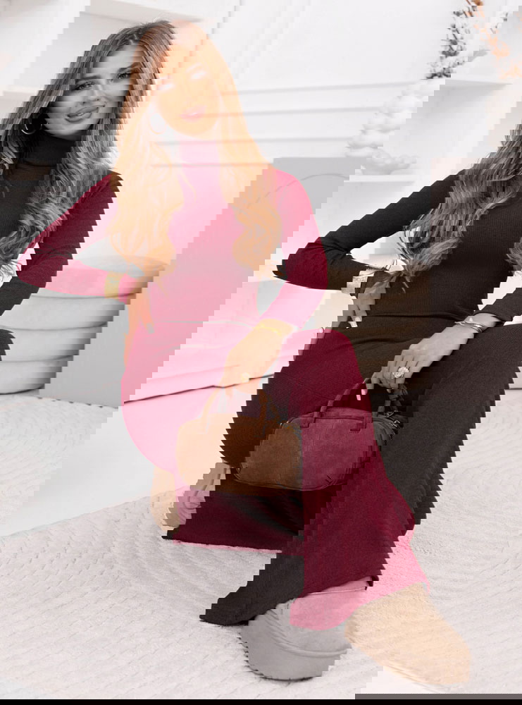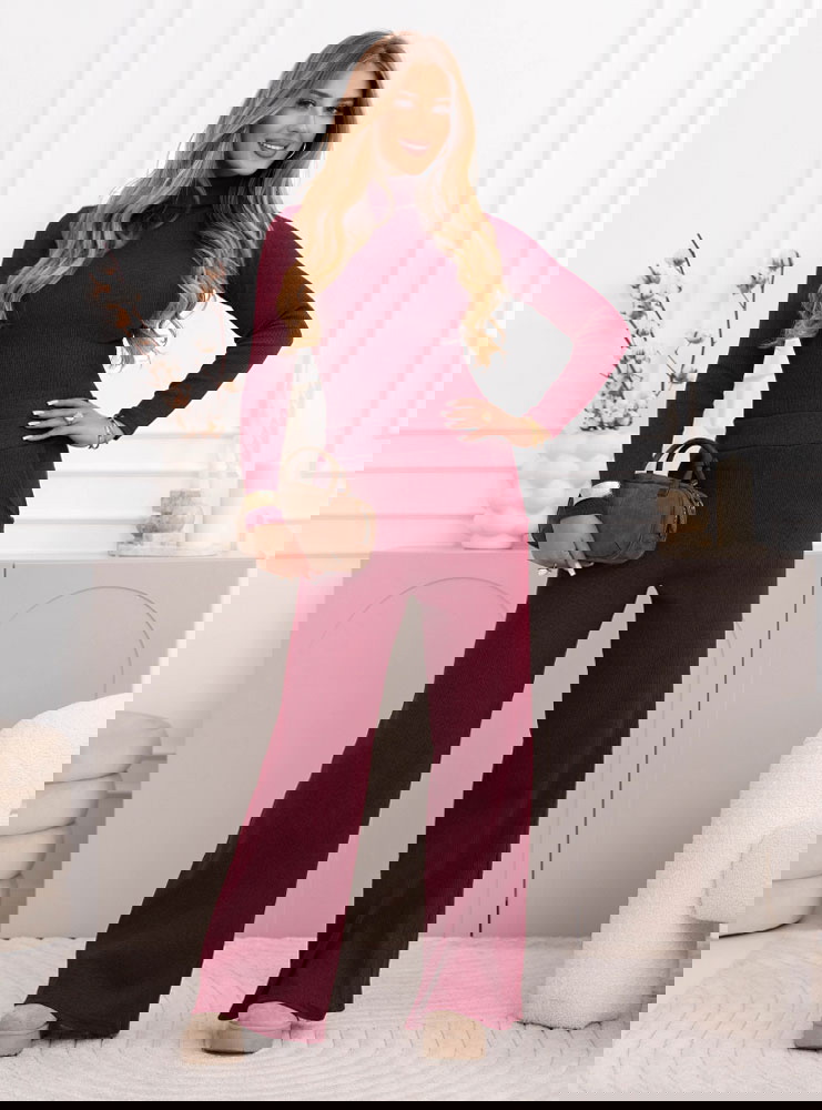 Bordowy prążkowany komplet bluzka z golfem i spodnie Anessaa