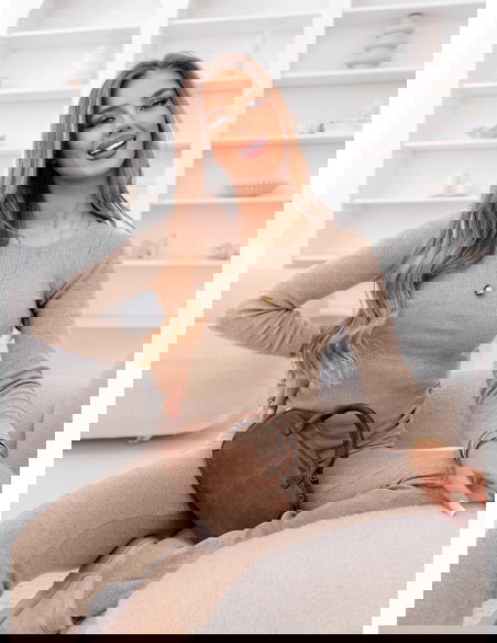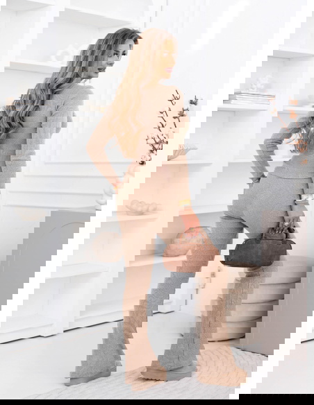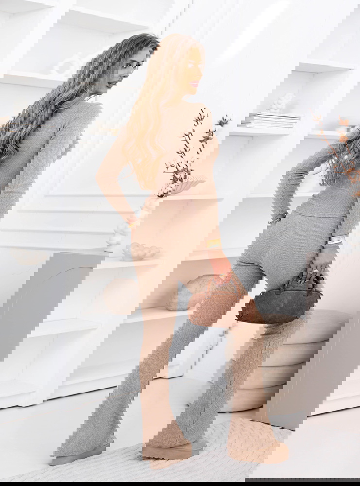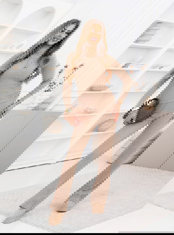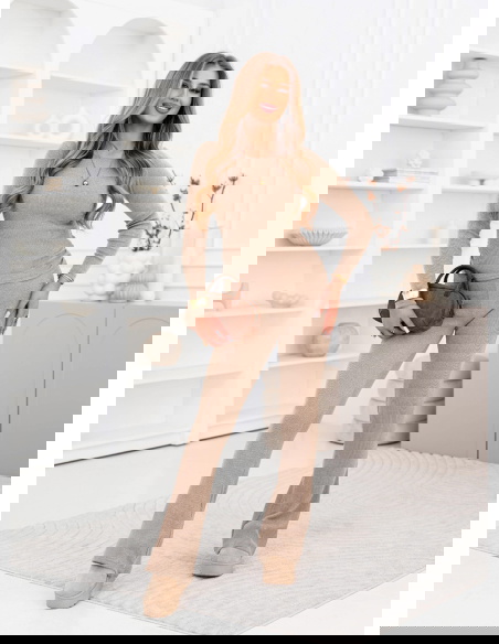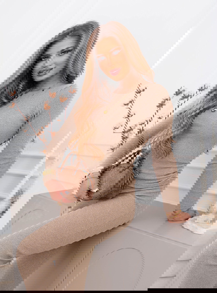 Beżowy prążkowany komplet dopasowana bluzka i spodnie Eliviaa