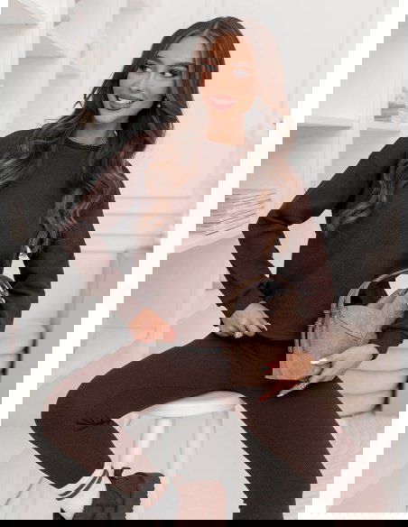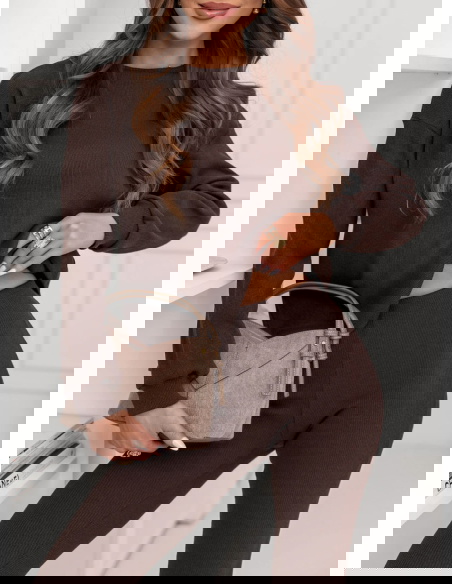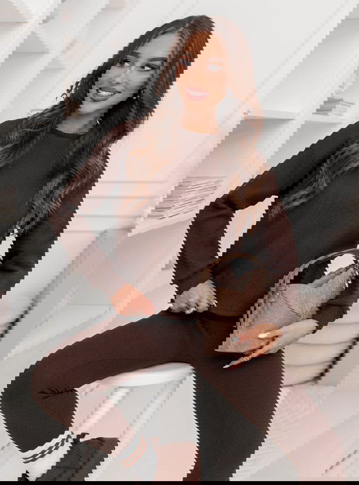 Czekoladowy prążkowany komplet bluzka i legginsy Rochellee to stylowy duet, który ułatwia codzienne wybory. Czekoladowy kolor wygląda elegancko i pasuje do wielu dodatków.