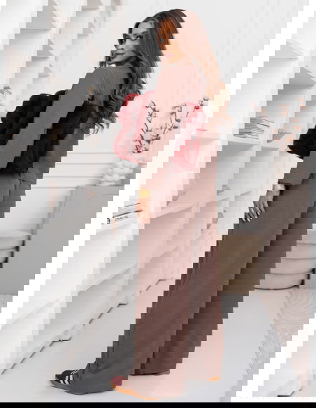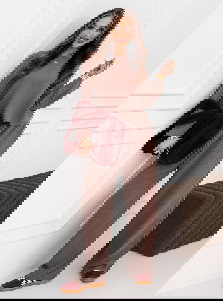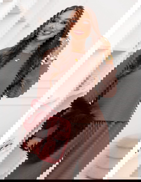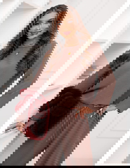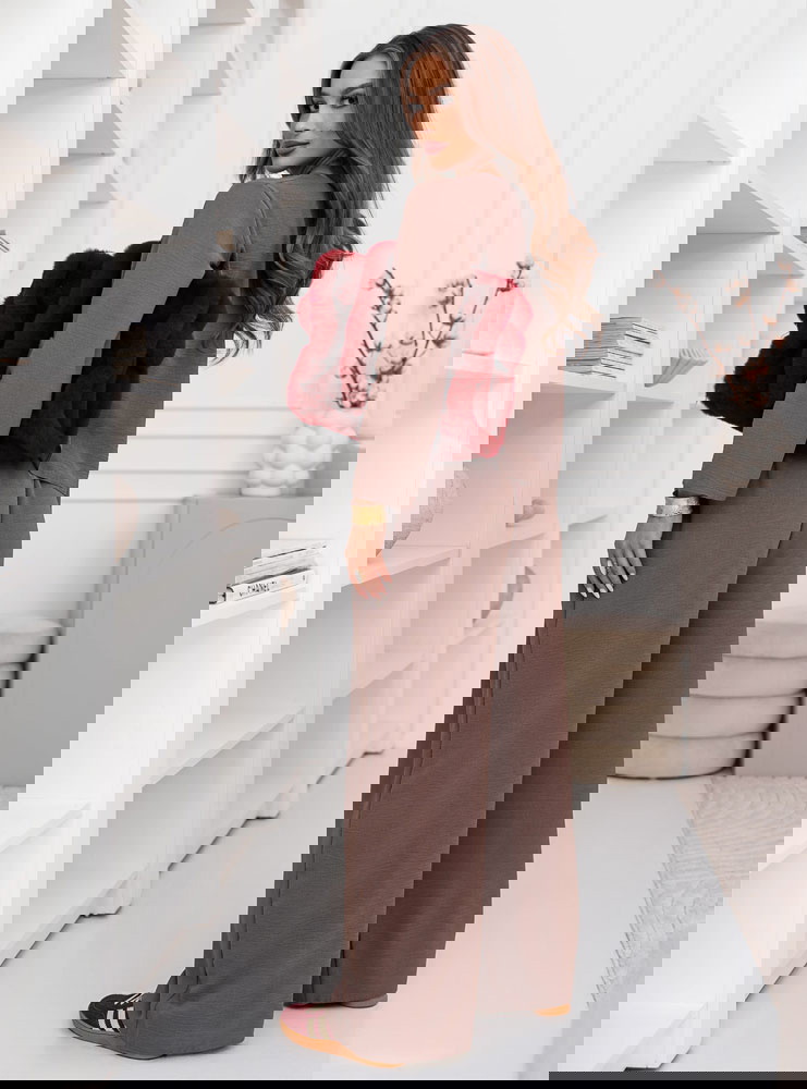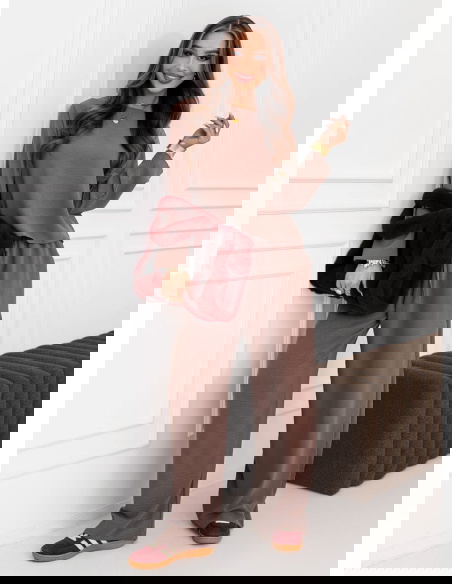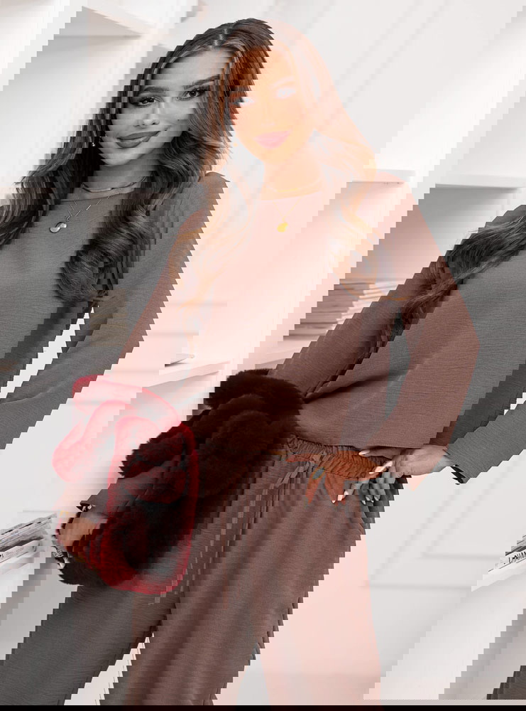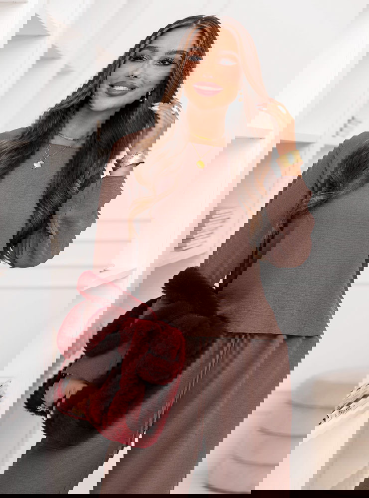 Komplet bluzka i szerokie spodnie Emelene - mocha mousse to gotowa stylizacja, która wygląda świetnie od razu po założeniu. Ten zestaw daje efekt „ubrana na tip-top”, bez długiego zastanawiania się przed szafą. Kolor mocha mousse prezentuje się niezwykle elegancko i pasuje do wielu dodatków. Luźniejsza bluzka pięknie układa się na sylwetce i daje swobodę ruchów. Szerokie spodnie dodają stylizacji lekkości i modnego charakteru. Razem tworzą spójną całość, która wygląda nowocześnie i stylowo. To propozycja, która sprawdzi się zarówno w domu, jak i poza nim. Wystarczy zmienić buty i biżuterię, by uzyskać zupełnie inny efekt. Zestaw świetnie wygląda w wersji minimalistycznej, ale też lubi mocniejsze akcenty. Jeśli cenisz wygodę, a jednocześnie chcesz wyglądać z klasą, ten komplet będzie strzałem w dziesiątkę.