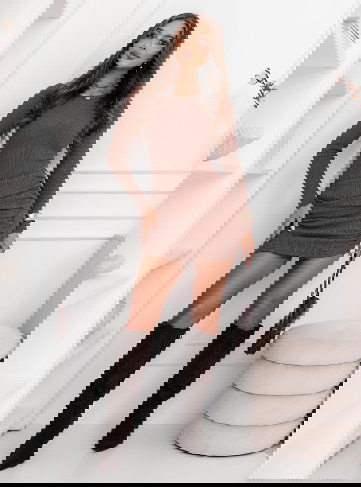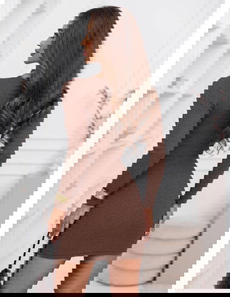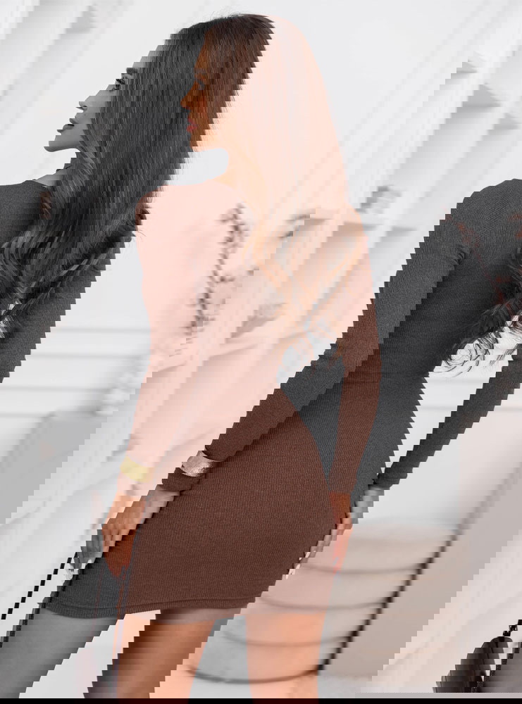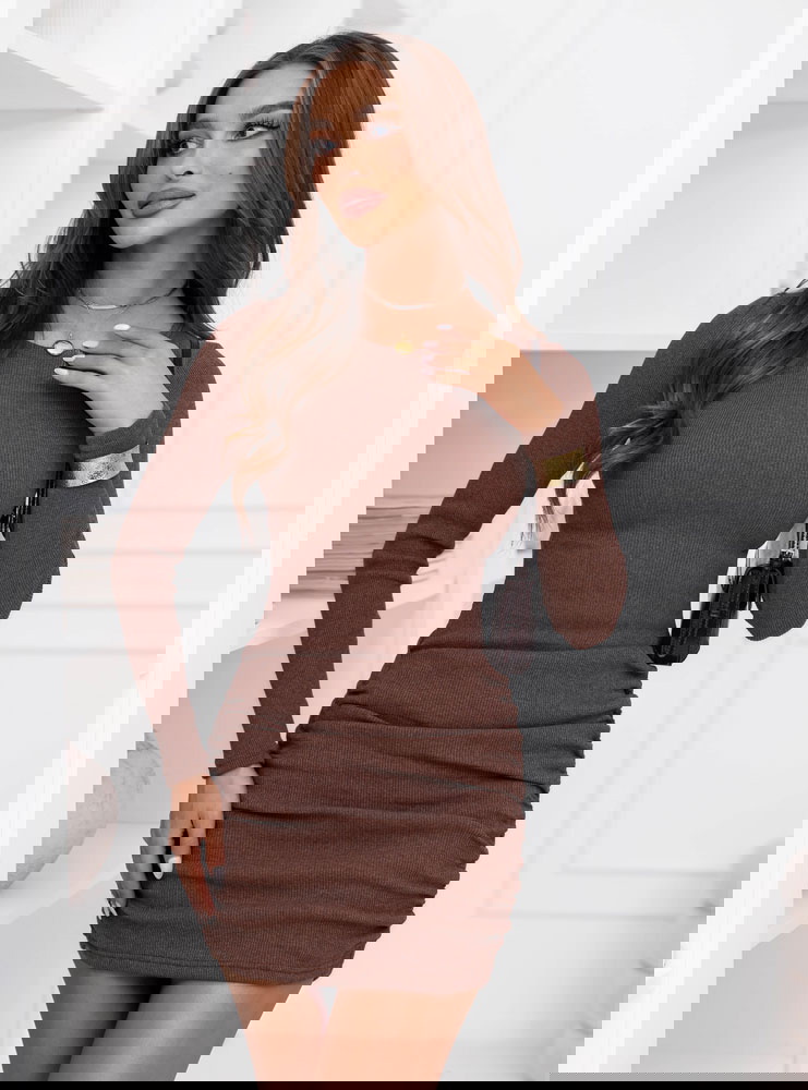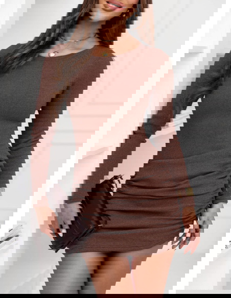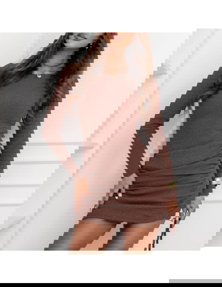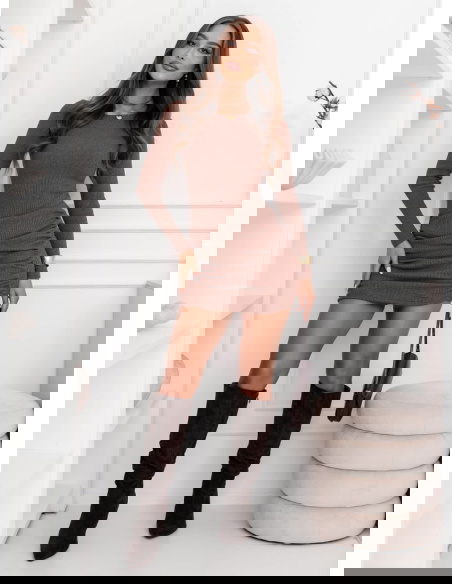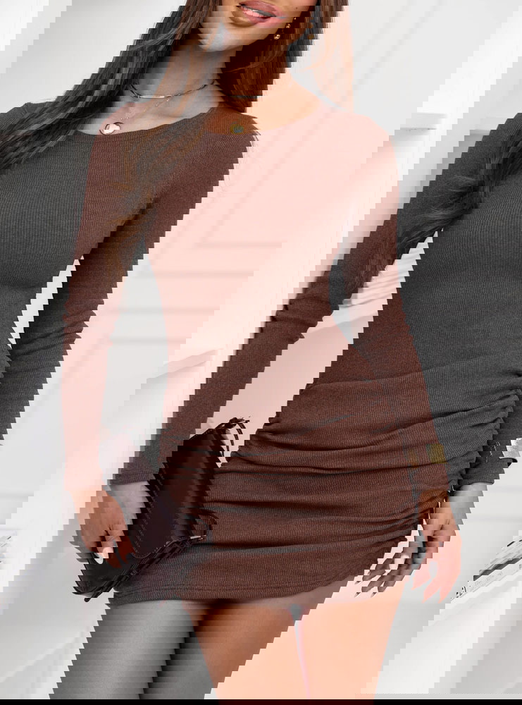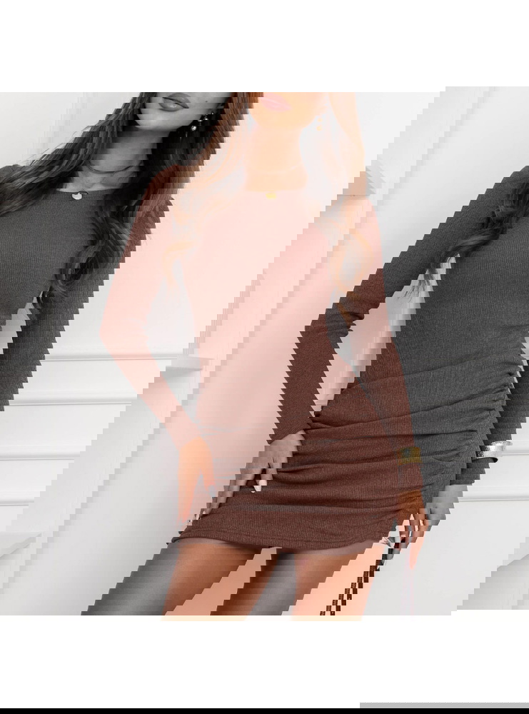Sukienka mini w prążek z marszczeniami Delightra - mocha mousse to propozycja, która od razu przyciąga spojrzenia swoim zmysłowym, kobiecym charakterem. Ma dopasowany fason, który pięknie podkreśla sylwetkę i eksponuje atuty figury. Marszczenia dodają całości lekkości i sprawiają, że stylizacja wygląda wyjątkowo efektownie. Długość mini świetnie podkreśla nogi i dodaje pewności siebie. Kolor mocha mousse jest elegancki, ciepły i łatwo wpisuje się w wiele stylów. Długi rękaw nadaje całości spójności i sprawia, że sukienka prezentuje się bardzo stylowo. Subtelny dekolt ładnie równoważy dopasowany krój i dodaje delikatności. To model, który wygląda świetnie zarówno solo, jak i w połączeniu z ulubionymi dodatkami. Wystarczy zmienić buty i biżuterię, aby uzyskać zupełnie inny efekt. Jeśli szukasz sukienki, która robi wrażenie bez nadmiaru, właśnie ją znalazłaś.