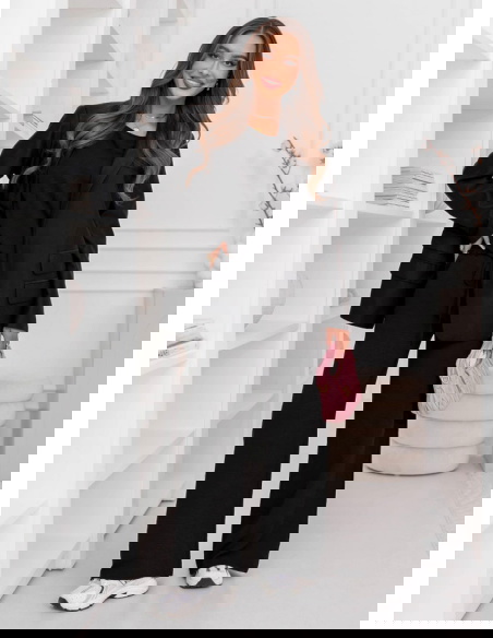 Czarny komplet bluzka i spodnie Judie to świetny wybór na dzień, kiedy jesteś w biegu i chcesz wyglądać schludnie bez kombinowania. Sprawdzi się na spotkania ze znajomymi, zakupy czy kawę w mieście.
