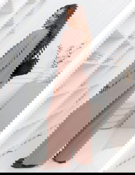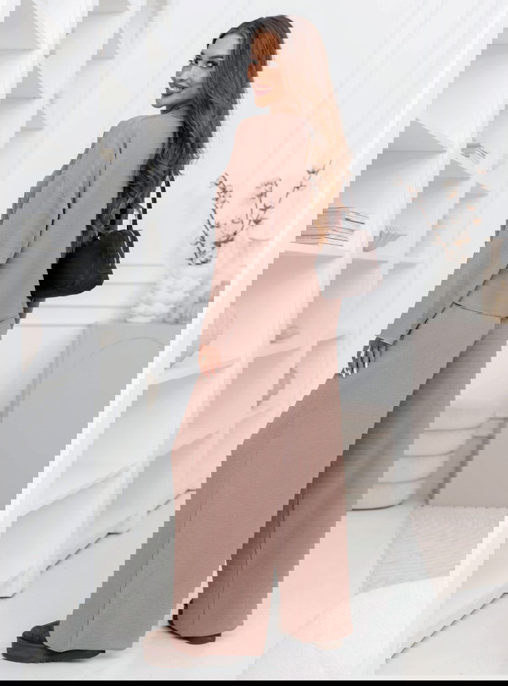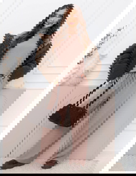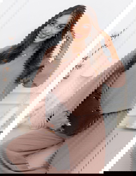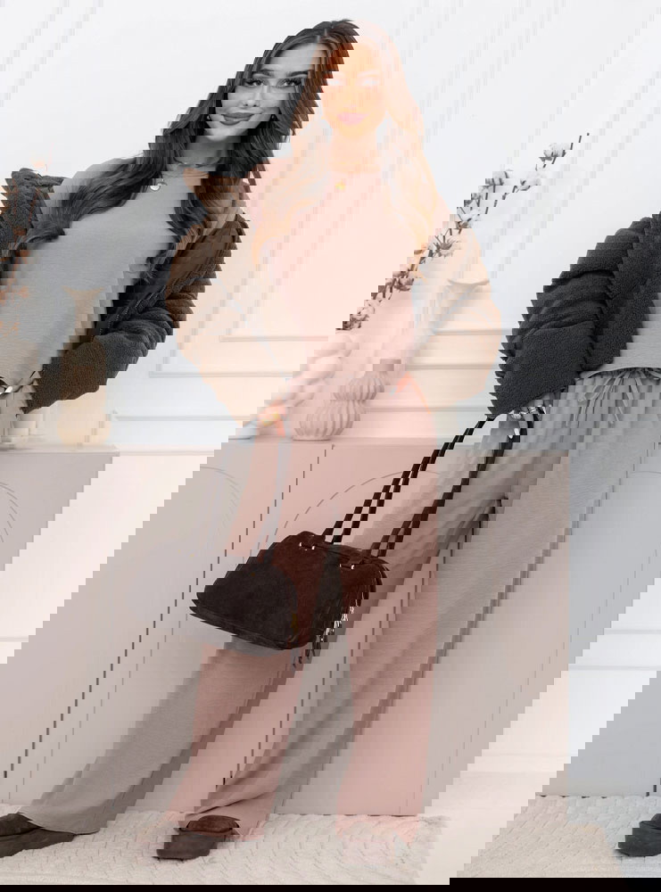 Komplet bluzka i spodnie Judie - mocha mousse to gotowa stylizacja, która robi wrażenie bez wysiłku. Stonowany odcień mocha mousse pięknie wpisuje się w codzienną garderobę. Luźniejsza bluzka z długim rękawem daje swobodę ruchu i wygląda nowocześnie. Opuszczona linia ramion dodaje całości lekkiego, miejskiego charakteru. Spodnie z szerokimi nogawkami optycznie wydłużają sylwetkę i tworzą elegancką linię. W pasie znajduje się praktyczne wiązanie, dzięki któremu łatwo dopasować komplet do siebie. Taki zestaw pozwala czuć się pewnie zarówno w domu, jak i poza nim. Minimalistyczna forma sprawia, że dodatki mogą grać pierwsze skrzypce. To propozycja dla osób, które lubią wyglądać schludnie, a jednocześnie na luzie. Wystarczy zmienić buty i torebkę, by od razu uzyskać inny efekt.