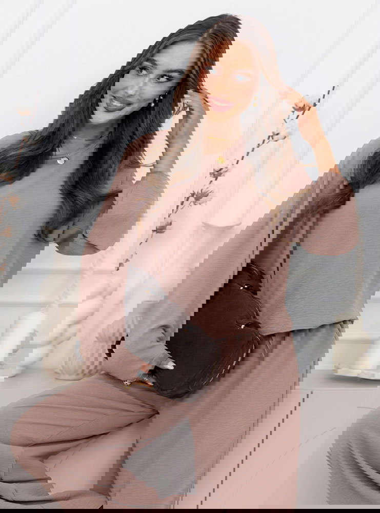 Komplet bluzka i spodnie Judie - mocha mousse sprawdzi się na zakupy, kawę na mieście i szybkie spotkanie ze znajomymi. To świetny wybór na podróż, kiedy liczy się wygoda i łatwe komponowanie looku.