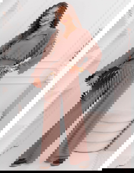 Komplet bluzka i szerokie spodnie Sezenne - mocha mousse to gotowa stylizacja, która wygląda spójnie i bardzo stylowo bez żadnego wysiłku. Bluzka ma luźniejszy charakter, a jednocześnie prezentuje się schludnie i nowocześnie. Subtelny kołnierzyk dodaje całości eleganckiej nuty i sprawia, że zestaw wyróżnia się na tle klasycznych kompletów. Rękawy zakończone ściągnięciem nadają formie lekkości i podkreślają dopracowany wygląd. Spodnie z szeroką nogawką pięknie układają się podczas ruchu i tworzą efekt „długiej” sylwetki. Talia jest zaznaczona, dzięki czemu całość wygląda proporcjonalnie i kobieco. Ten komplet świetnie sprawdza się wtedy, gdy chcesz czuć się swobodnie, ale wyglądać bardzo „na poziomie”. To propozycja, którą łatwo wystylizować zarówno na spokojny dzień, jak i na bardziej dopracowane wyjście. Zestaw daje dużo możliwości dodatków – możesz postawić na minimalizm albo mocniejszy akcent. Jeśli lubisz połączenie wygody i modnego efektu, ten komplet szybko stanie się jednym z ulubionych.