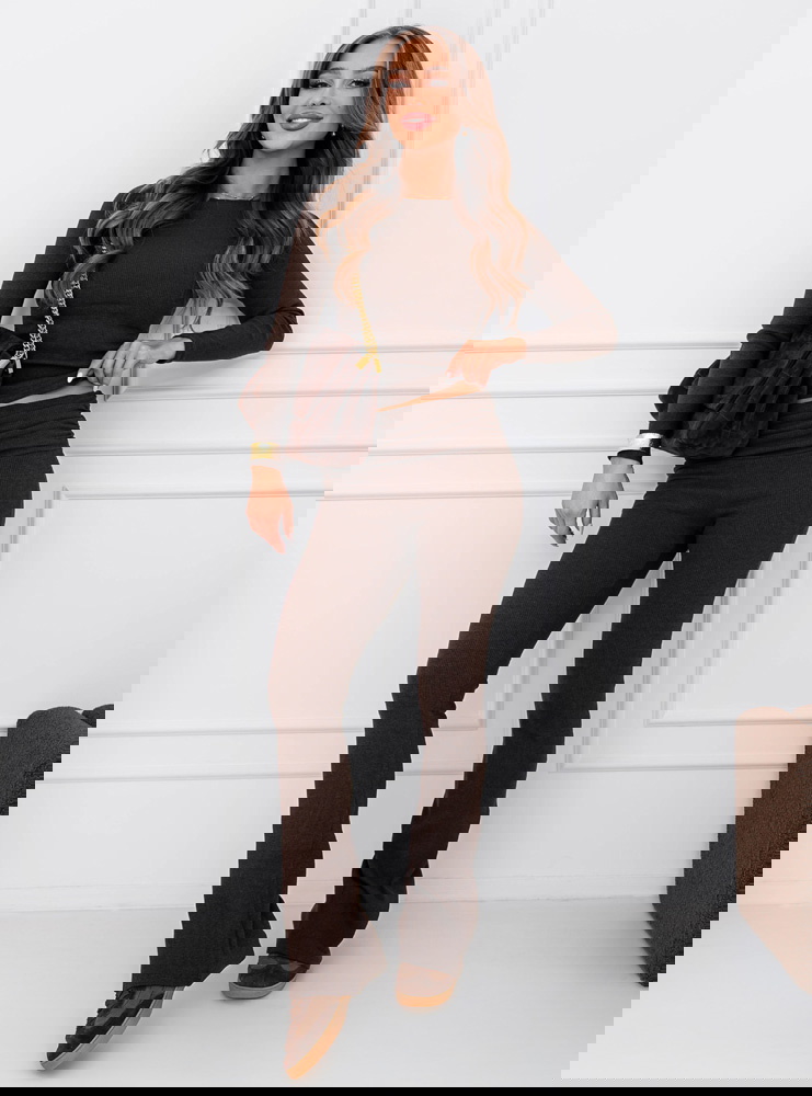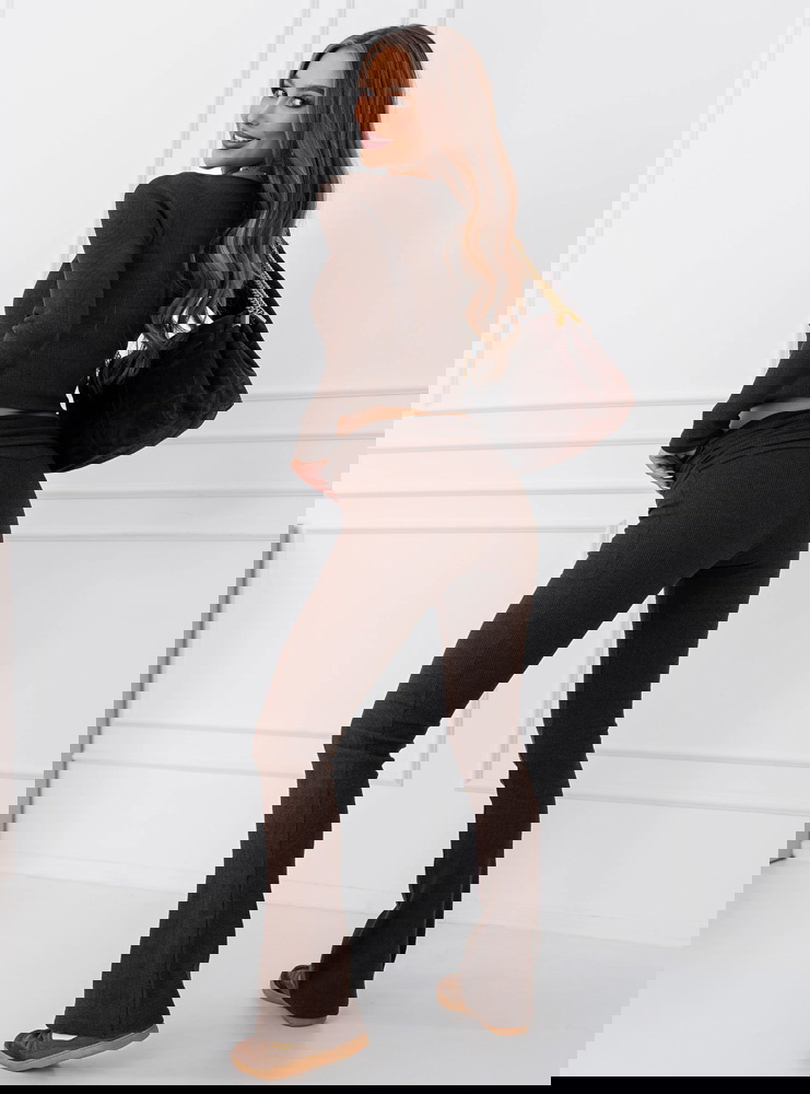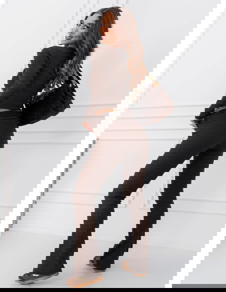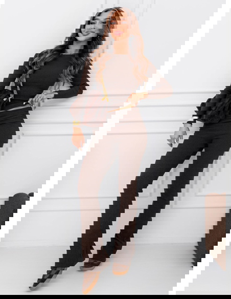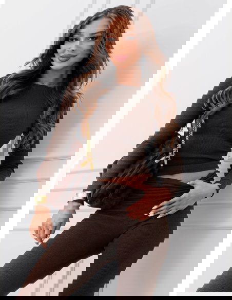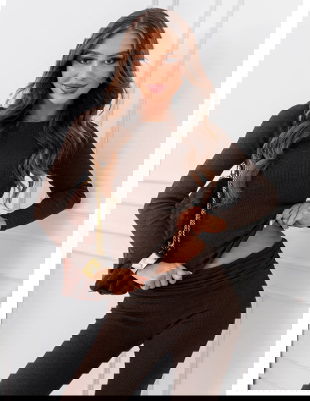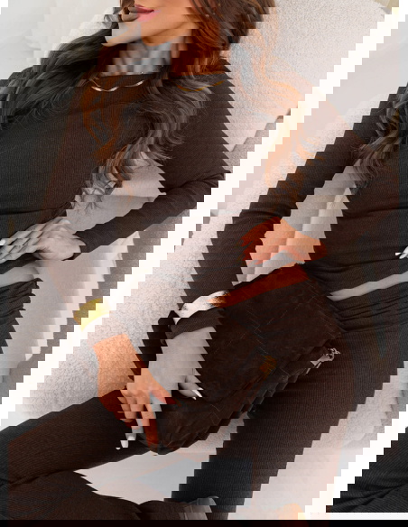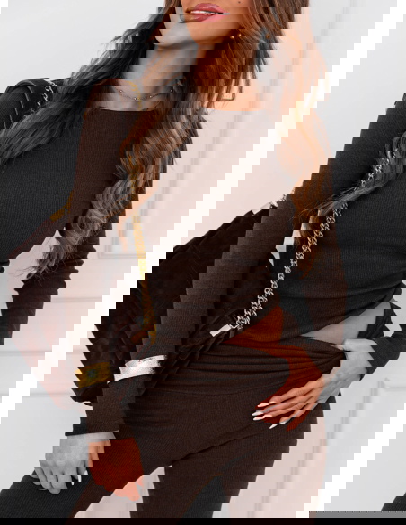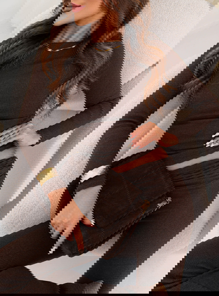 Czekoladowy prążkowany komplet bluzka i spodnie Hannela to szybki sposób na stylizację, która zawsze wygląda dobrze. Czekoladowy kolor dodaje elegancji i pięknie podkreśla całość bez przesady.