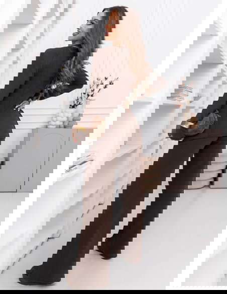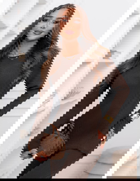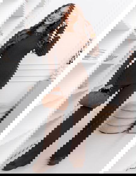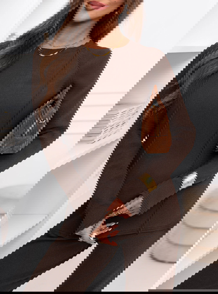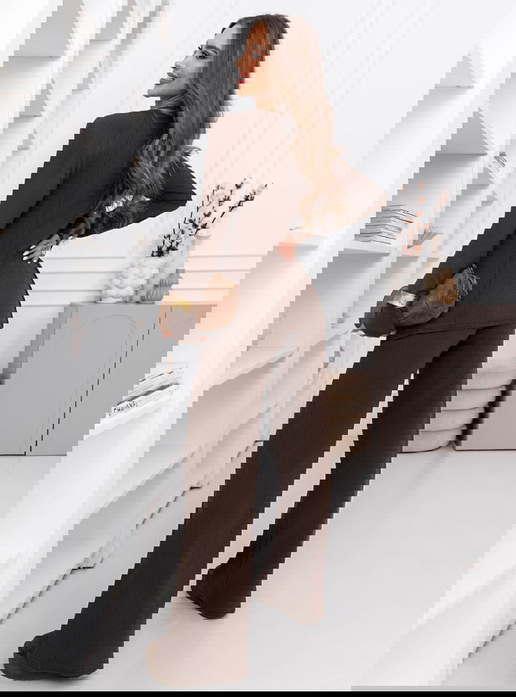 Czekoladowy prążkowany komplet bluzka i szerokie spodnie Yeselle to zestaw, który wygląda stylowo od pierwszej chwili i nie wymaga długiego planowania stylizacji. To propozycja dla osób, które lubią gotowe rozwiązania, ale nadal chcą wyglądać kobieco i nowocześnie. Dopasowana bluzka pięknie układa się na sylwetce i daje efekt uporządkowanej, spójnej całości. Długie rękawy nadają kompletowi eleganckiej równowagi, dzięki czemu sprawdzi się nie tylko na co dzień. Prążkowana faktura przyciąga wzrok i dodaje charakteru, a jednocześnie pozostaje subtelna i łatwa w stylizowaniu. Szerokie spodnie tworzą modną linię i w ruchu prezentują się wyjątkowo lekko. Czekoladowy kolor dodaje całości głębi i sprawia, że zestaw wygląda bardzo „dopieszczony” nawet w minimalistycznej wersji. To komplet, który można nosić jako total look albo rozdzielić i wykorzystać w innych zestawach. Dzięki temu zyskujesz więcej możliwości w szafie bez dokładania kolejnych rzeczy. Jeśli szukasz kompletu, który robi wrażenie, ale nadal jest prosty i praktyczny, ten model będzie świetnym wyborem.