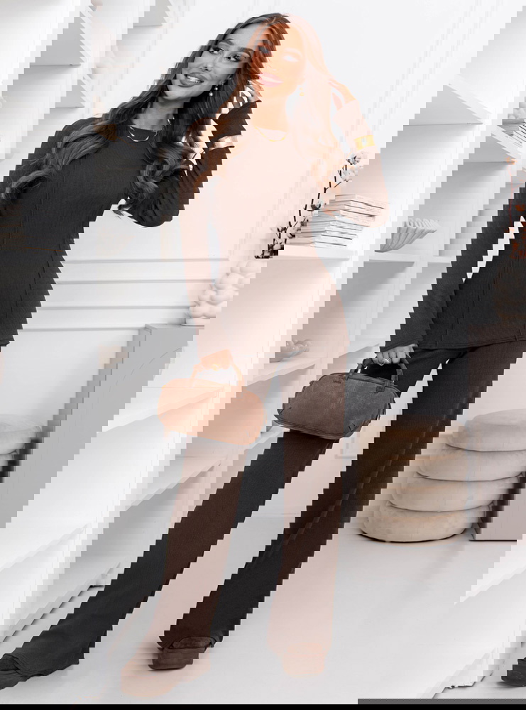 Czekoladowy prążkowany komplet bluzka i szerokie spodnie Yeselle możesz nosić razem lub wykorzystać każdy z elementów osobno, tworząc wiele różnych zestawów. Jeśli chcesz mieć w szafie pewniaka, który sprawdzi się w wielu sytuacjach i zawsze wygląda dobrze, ten komplet będzie idealnym wyborem.