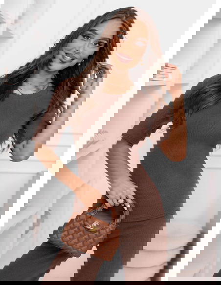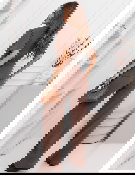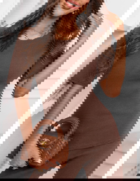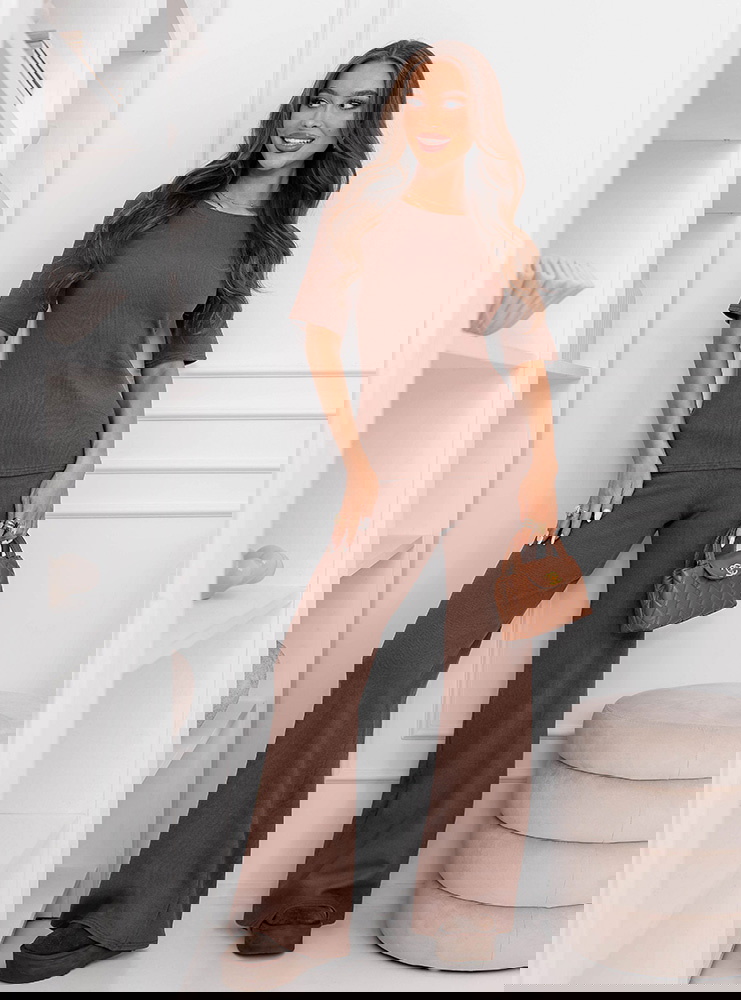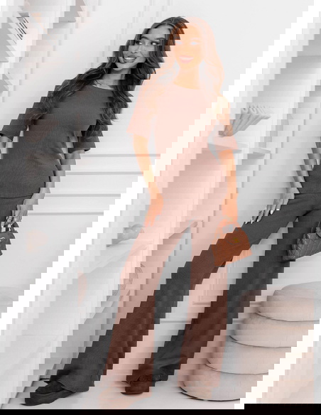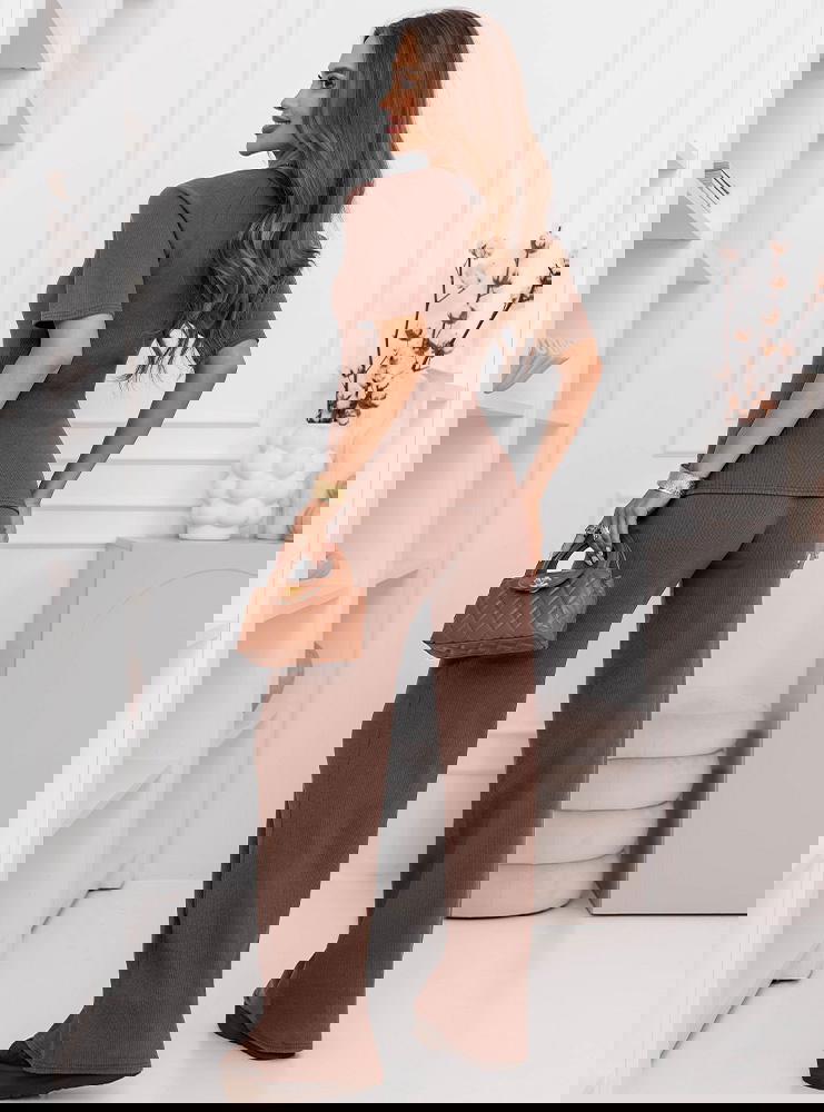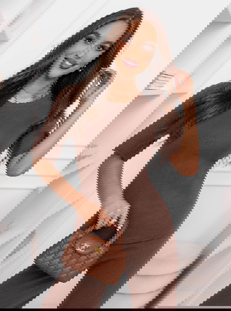 Prążkowany komplet bluzka z krótkim rękawem i spodnie Clotele - mocha mousse to świetny wybór na codzienne wyjścia, gdy chcesz wyglądać dobrze bez długich przygotowań. Sprawdzi się na zakupy, spacer, kawę czy spotkanie ze znajomymi.