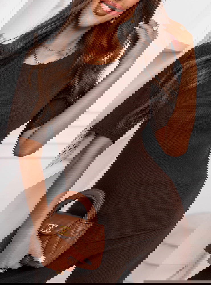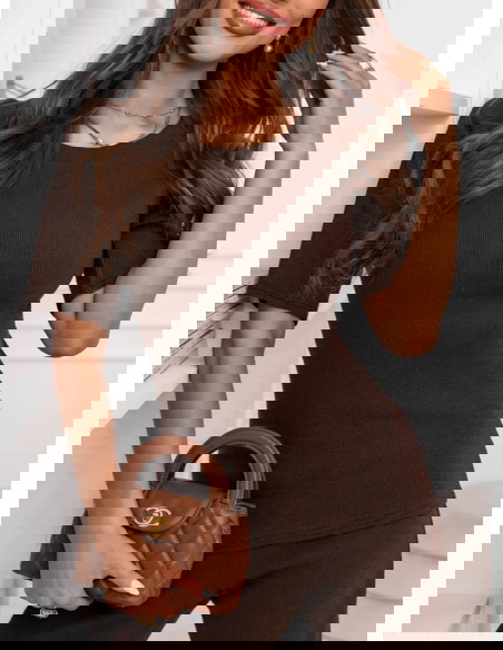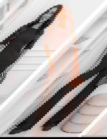 Czekoladowy prążkowany komplet bluzka z krótkim rękawem i spodnie Clotele to stylizacja, która sprawdza się wtedy, gdy chcesz wyglądać modnie i naturalnie. Prosta góra z krótkim rękawem nadaje lekkości i świetnie pasuje do codziennych planów.