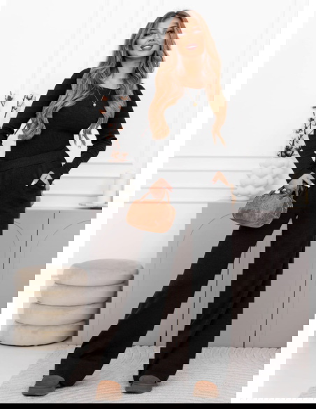 Czarny prążkowany komplet bluzka i szerokie spodnie Minarose to szybki sposób na dopracowany look. Klasyczny kolor ułatwia stylizowanie i pasuje do wielu dodatków.