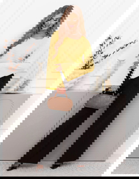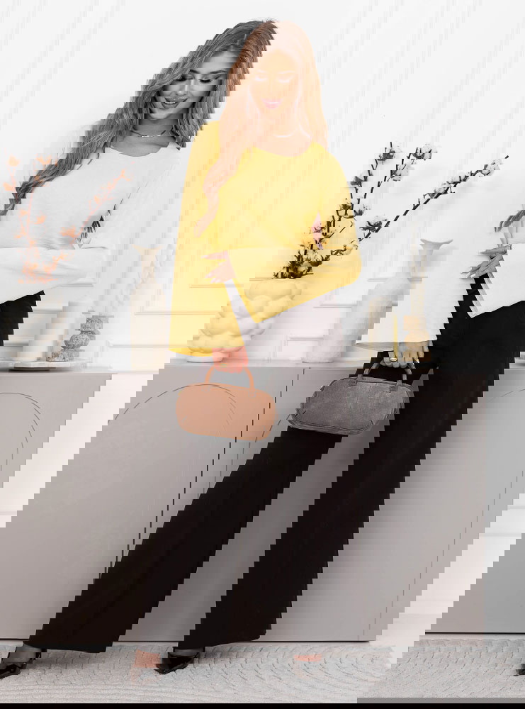 Fason jest prosty, dlatego całość wygląda schludnie. Najmocniej wyróżniają się długie, szeroko rozszerzane rękawy, które nadają charakter i sprawiają, że góra wygląda ciekawiej z każdej strony. Dekolt jest gładki i dość szeroki, więc linia przy szyi zostaje spokojna i nie odciąga uwagi od rękawów. To bluzka, którą łatwo zestawisz z wieloma dołami, bo działa i w wersji codziennej, i w bardziej eleganckiej.