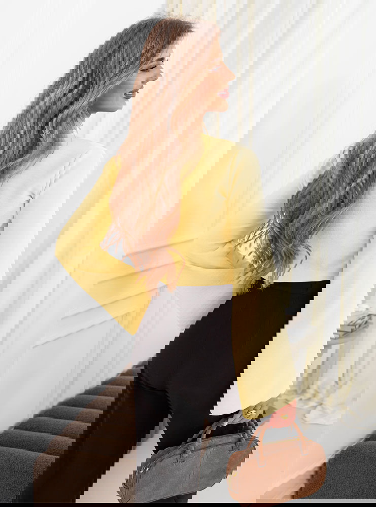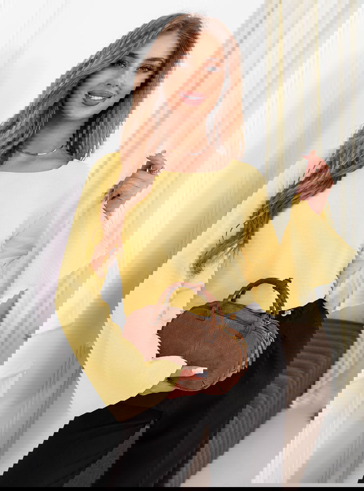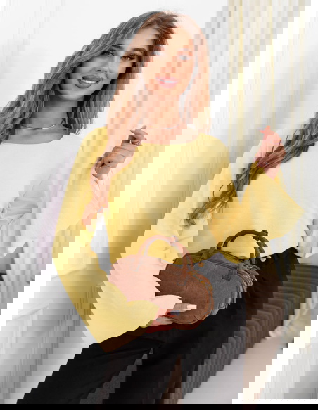 Kluczowy detal to rękawy w kształcie dzwonu. Dodają objętości na górze, dlatego najlepiej wyglądają z dołem o prostej linii albo bardziej dopasowanym. Fajnie wypada też, gdy wsuniesz bluzkę do środka i zaznaczysz talię paskiem, bo proporcje robią się od razu czytelne.