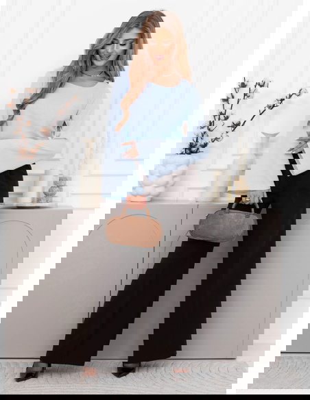Całość wygląda schludnie i bardzo estetycznie. Szerokie, rozszerzane rękawy od razu przyciągają uwagę i nadają całości ciekawą formę. Dekolt jest prosty i dość szeroki, dzięki czemu góra wygląda spokojnie, a rękawy robią największy efekt. To fason, który łatwo zestawisz z różnymi dołami, bo nie narzuca jednego stylu.