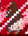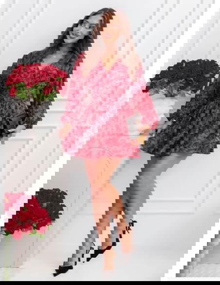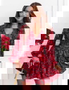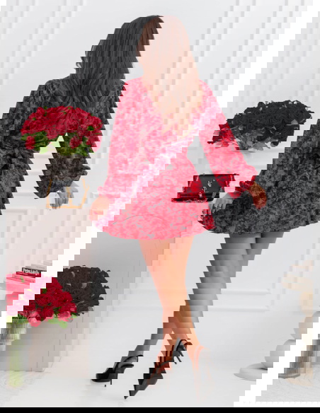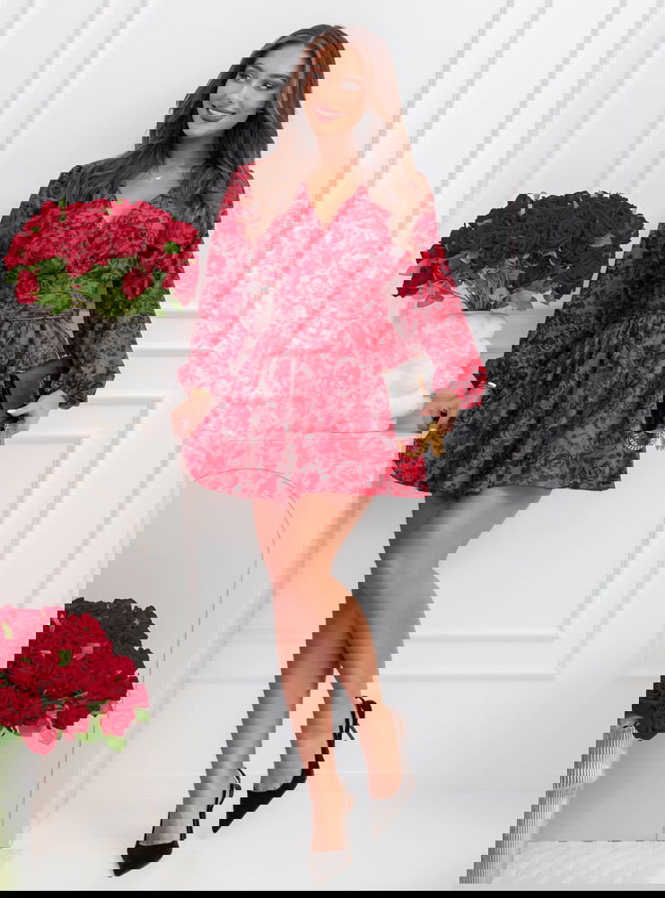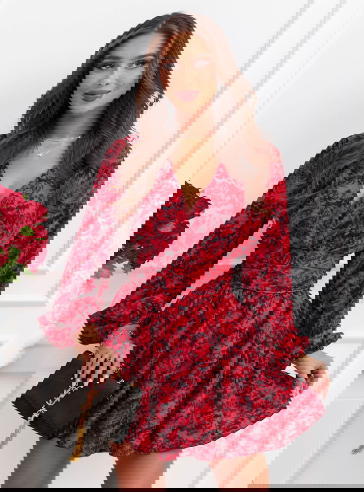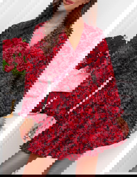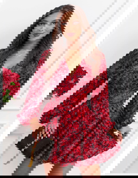 Całość prezentuje się spójnie i bardzo efektownie. Intensywny, kwiatowy wzór na czerwonym tle nadaje charakter i sprawia, że stylizacja nie ginie w tłumie. Bufiaste rękawy budują górę i dodają objętości, co dobrze równoważy krótki dół. Bez problemu połączysz go z prostymi dodatkami, bo sam wzór robi tu większość pracy.