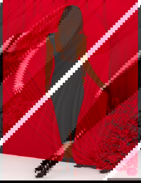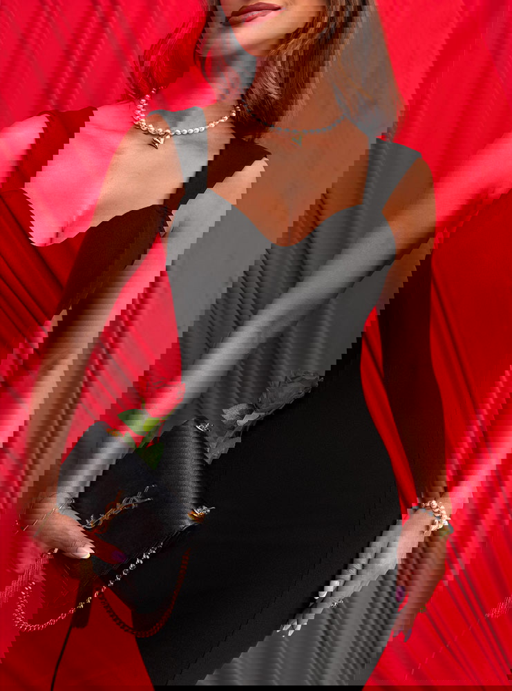 Fason jest gładki i dopasowany. Długość midi porządkuje całość i tworzy bardzo czystą linię. Dekolt ma miękki kształt i ładnie otwiera górę, nie dominując stylizacji. Czerń sprawia, że całość jest uniwersalna i łatwa do zestawienia.