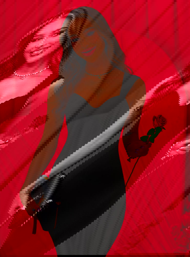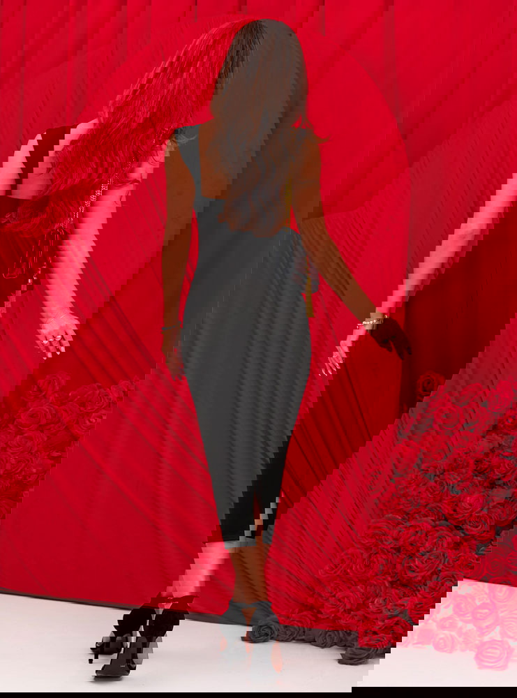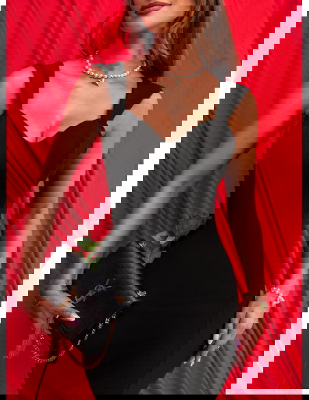 Najważniejsze jest tu proste prowadzenie formy. Sukienka trzyma jednolitą linię od góry do dołu i wygląda bardzo spójnie. Z tyłu widać rozcięcie, które przełamuje dopasowany fason i dodaje lekkości w odbiorze. Całość dobrze łączy się z małą torebką na łańcuszku albo krótką marynarką.