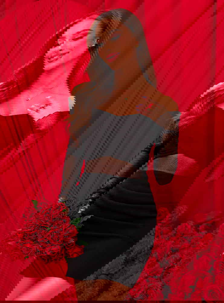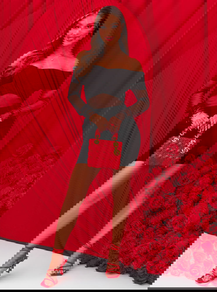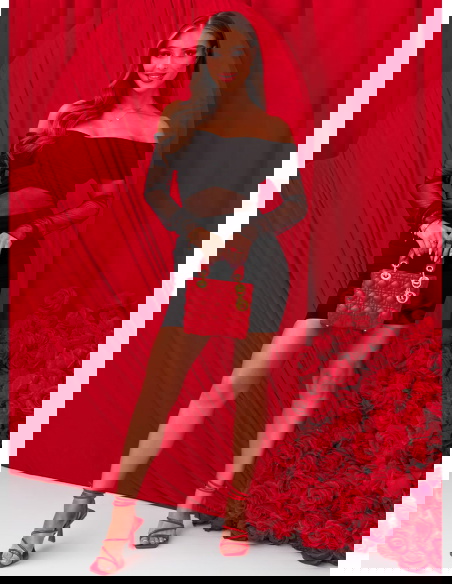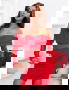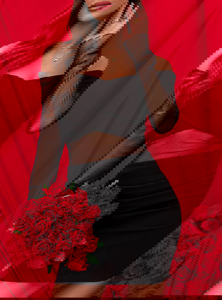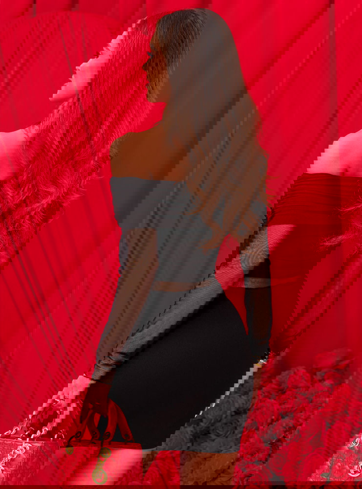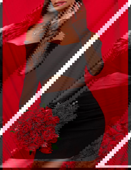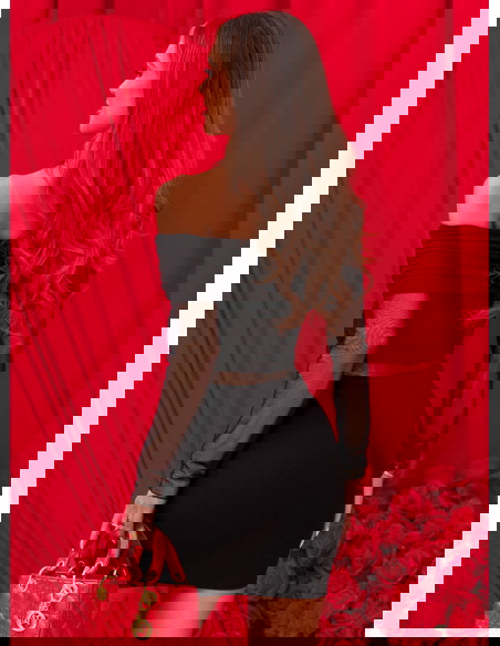 Sukienka ładnie układa się na sylwetce i podkreśla jej linię. Tiulowa talia delikatnie zaznacza środek, dodając całości subtelnej lekkości, a tiulowe rękawy wprowadzają transparentny akcent, który przełamuje gładką formę. Góra z odkrytymi ramionami wygląda elegancko i spójnie z resztą kroju.