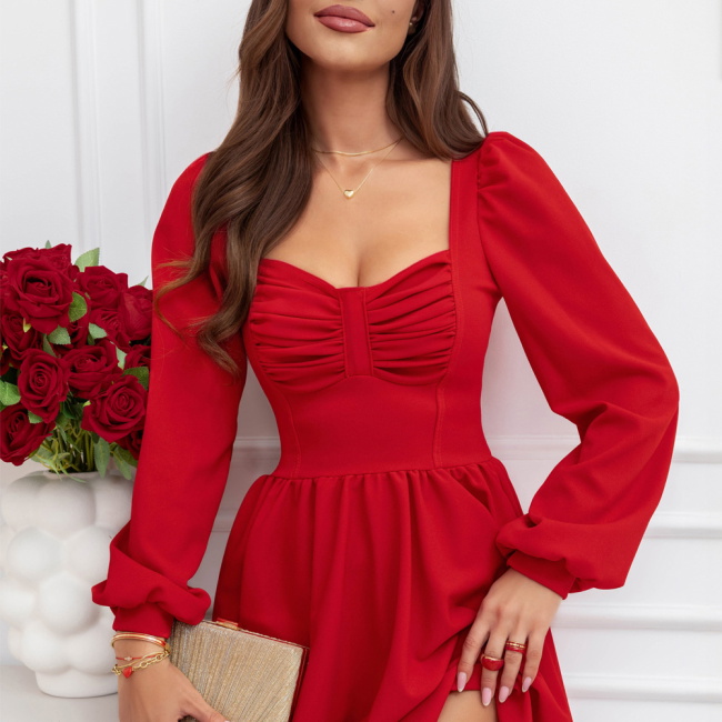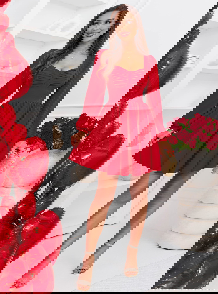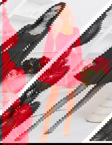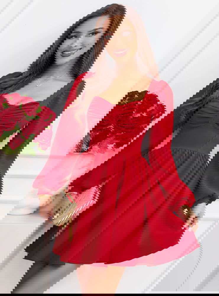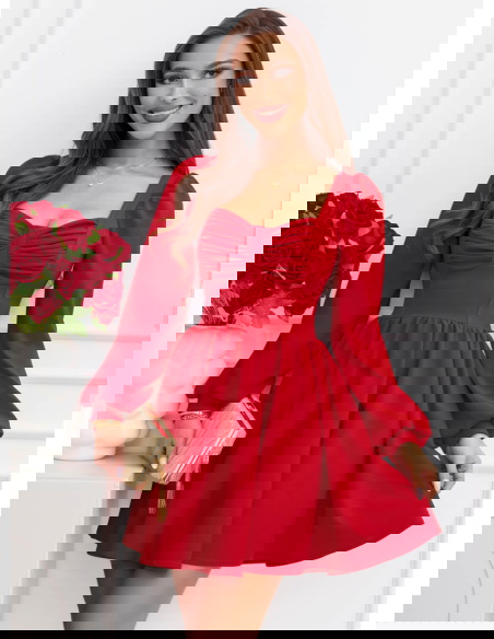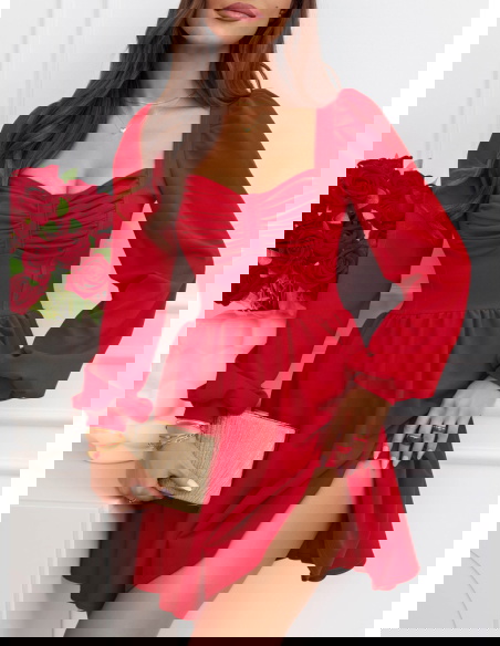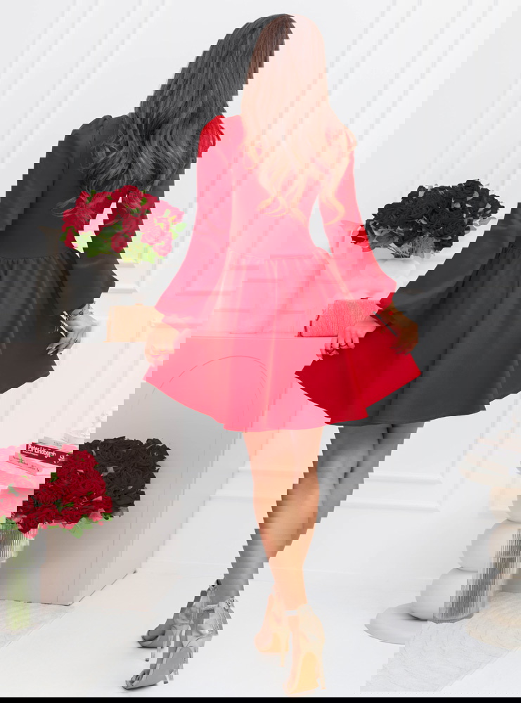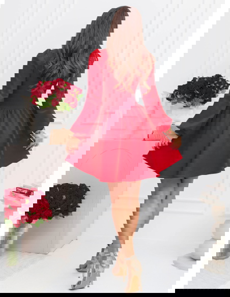 Malinowa rozkloszowana sukienka z bufiastymi rękawami Lovenna