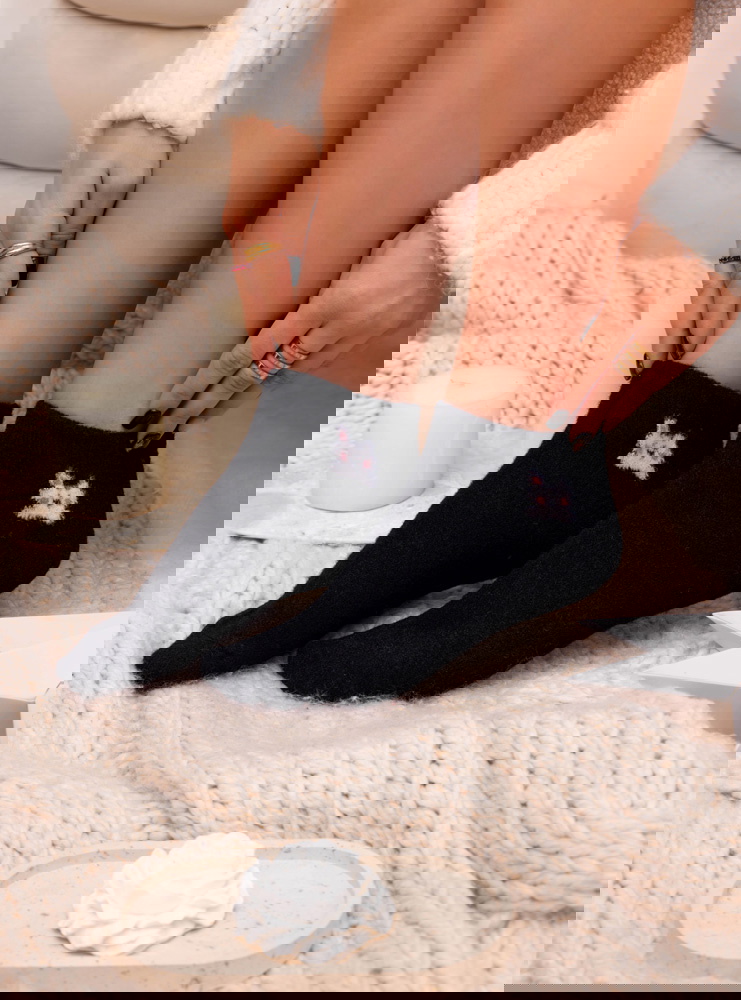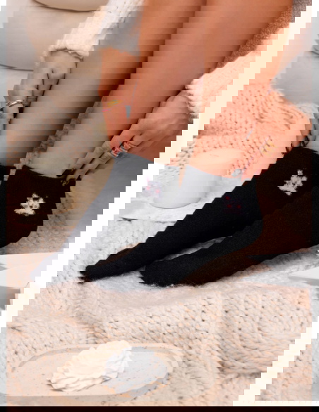 Skarpetki z ozdobnym motywem Nommi – wzór 1 to uroczy akcent, który wprowadza do stylizacji odrobinę luzu i domowego klimatu. Ciemna baza została przełamana delikatnym, haftowanym motywem, który przyciąga spojrzenie i nadaje całości przyjemnego charakteru. Model prezentuje się miękko i przytulnie, idealnie wpisując się w codzienne, swobodne zestawy.